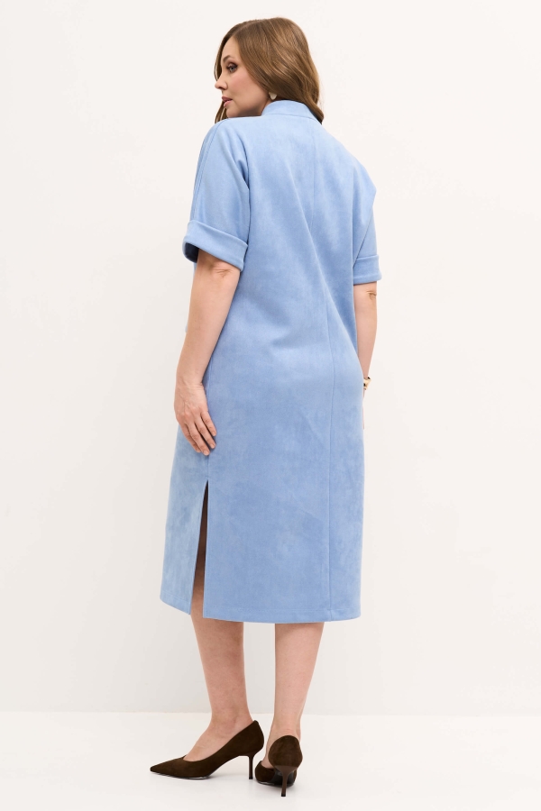 Комфортное платье нежного оттенка из эко-замши. Модель прямого, слегка свободного силуэта. Цельнокроеный рукав и широкие манжеты, воротник-стойка, разрезы по бокам, ложные карманы. Длина миди.