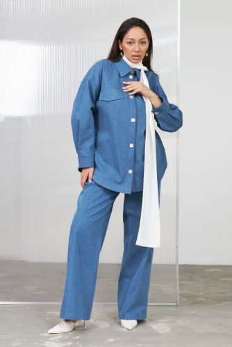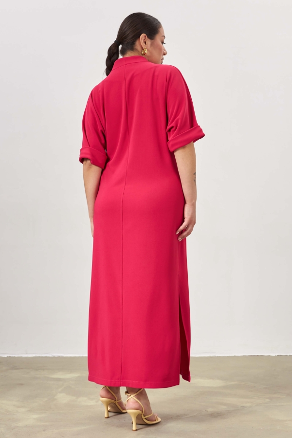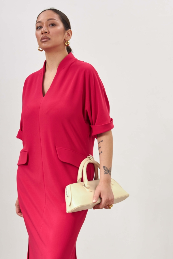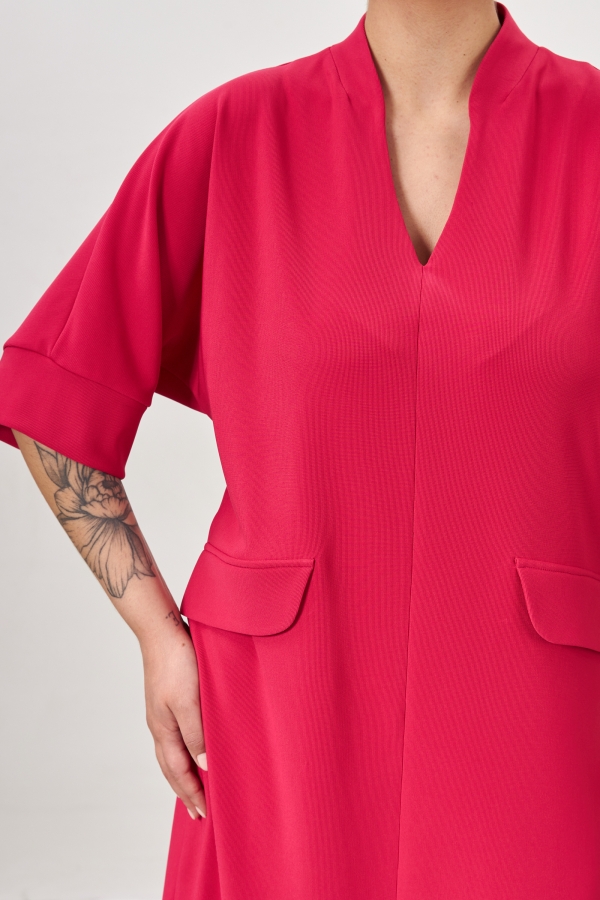 Яркое свободное платье прямого силуэта с цельнокроенным рукавом и широкими манжетами, воротник-стойка, разрезы по бокам, ложные карманы. Длина миди.