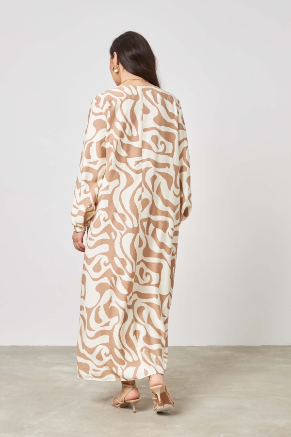 Платье макси свободное с v-образной горловиной и декоративной деталью на уровне талии, под которую заложены сборки по переду. Рукава с манжетой, спущенная линия плеча.