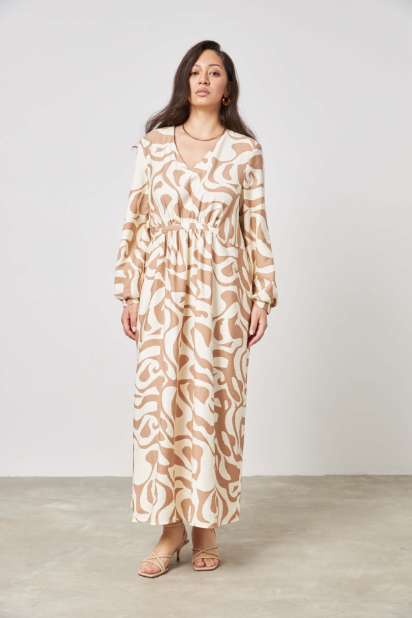 Платье макси свободное с v-образной горловиной и декоративной деталью на уровне талии, под которую заложены сборки по переду. Рукава с манжетой, спущенная линия плеча.