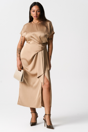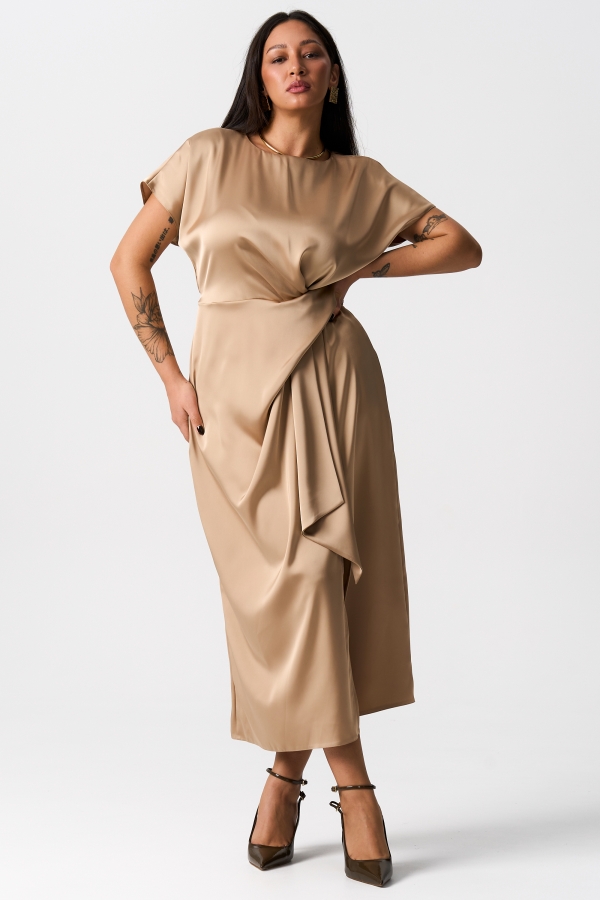 Модель полуприлегающего силуэта. По переду декоративная драпировка и разрез. По спинке застежка на петлю и пуговицу, линия талии укреплена резинкой. Рукав спущенный.