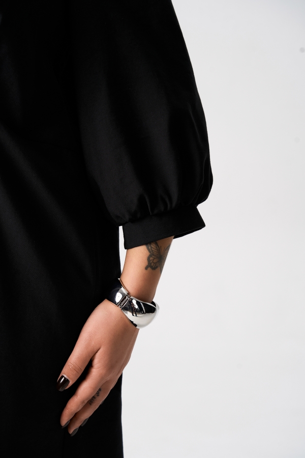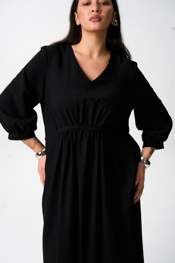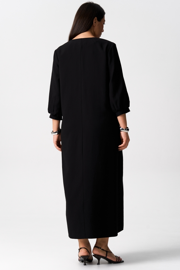 Длина макси. Свободное с v-образной горловиной. Декоративная деталь на уровне талии, под которую заложены сборки по переду. Рукава 3/4 с манжетой. Спущенная линия плеча.