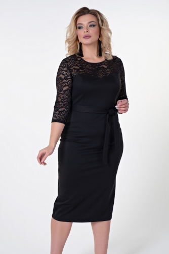Платье приталенного силуэта из однотонного трикотажа. Круглый вырез горловины обработан внутренней обтачкой. Втачные рукава длинной 3/4. Отрезная линия талии. По спинке потайная застежка на молнию. Пояс из основного материала входит в комплект.
