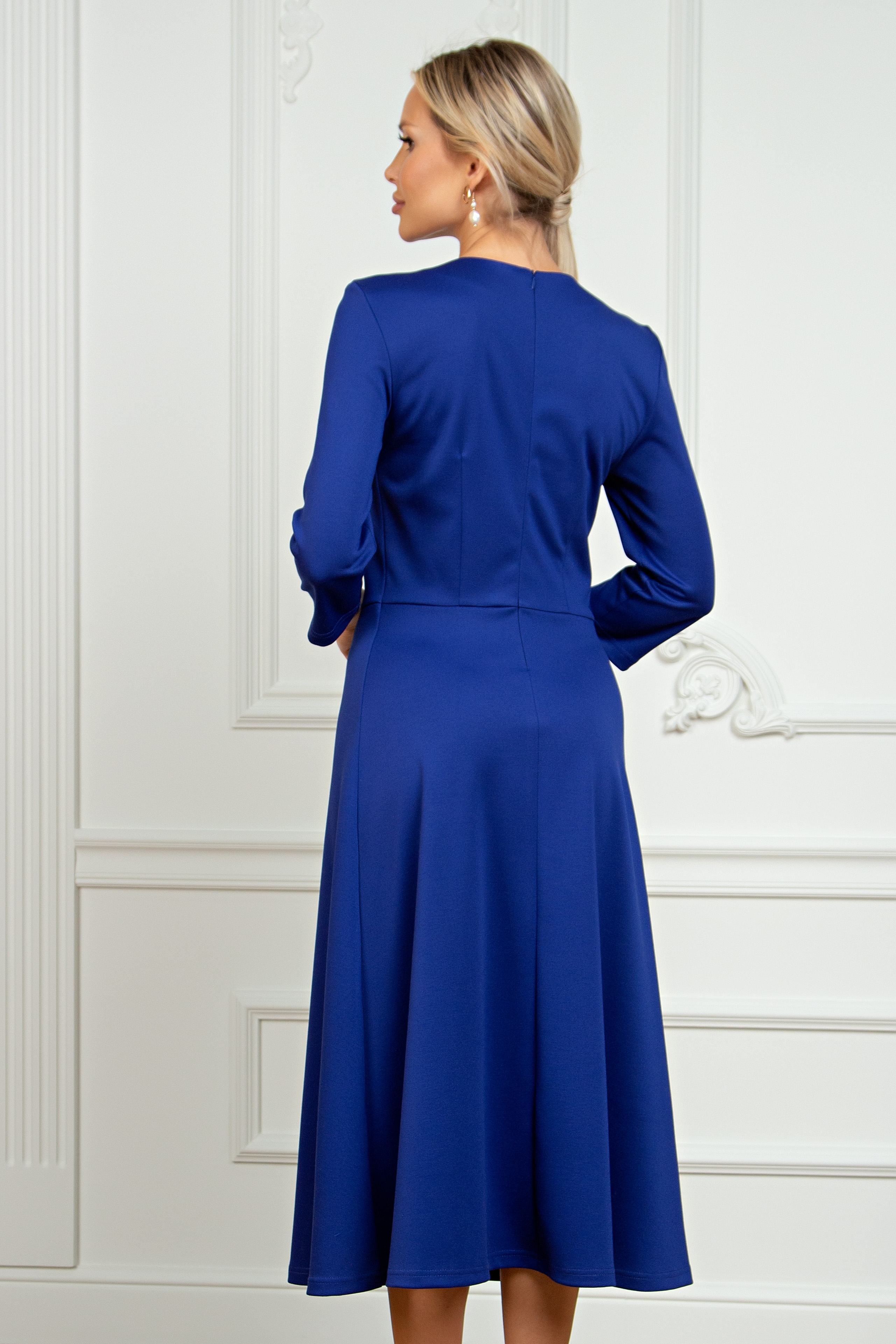 Платье приталенного силуэта из однотонного трикотажа. Круглый вырез горловины обработан внутренней обтачкой. Втачные рукава длинной 3/4. Отрезная линия талии. По спинке потайная застежка на молнию. Пояс из основного материала входит в комплект.
