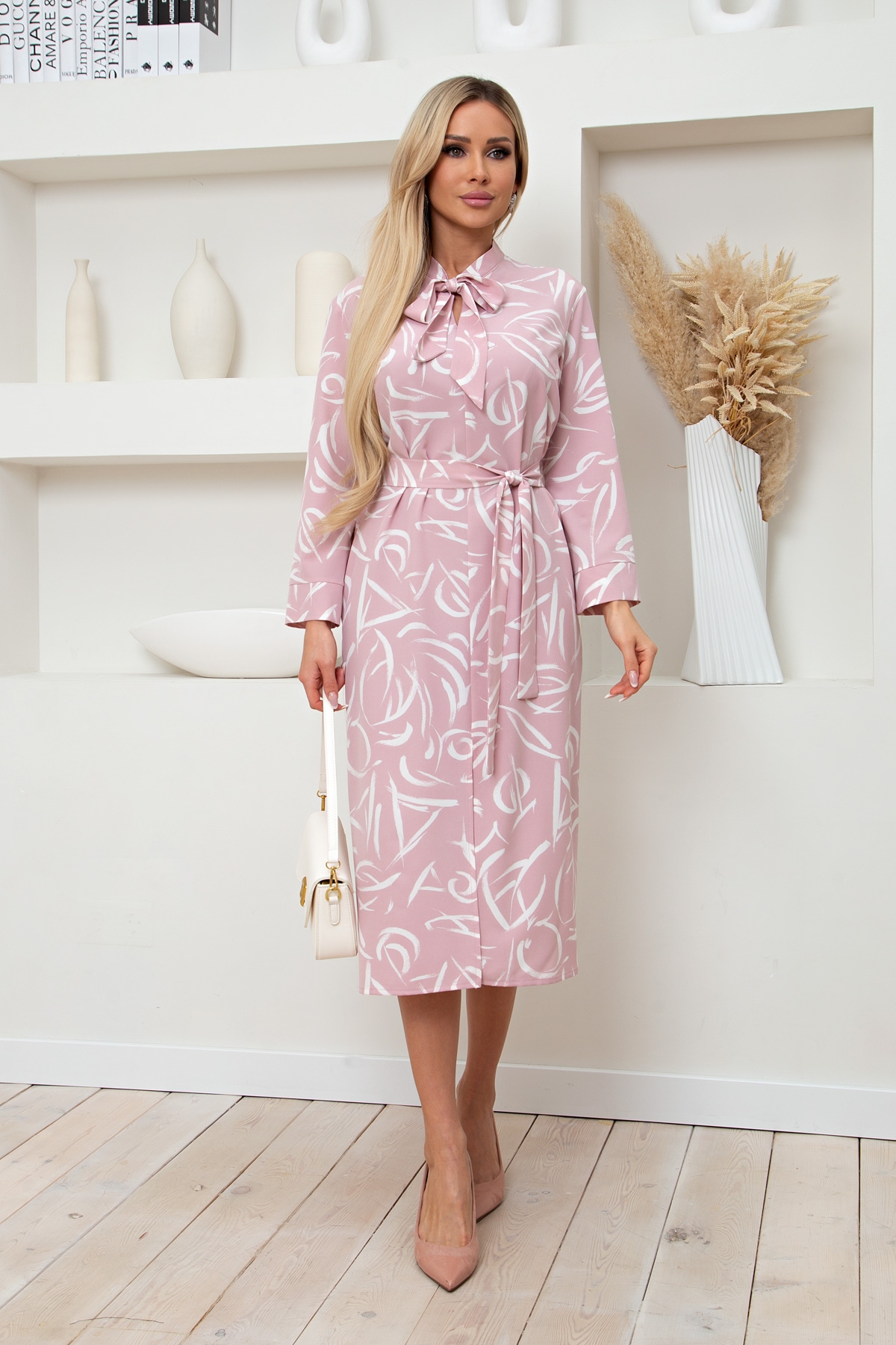 Женственное платье прямого кроя из легкой ткани Ниагара. Горловина оформлена воротником стойка, переходящим в пышный бант на завязках. Втачной рукав длинной 3/4 с притачной манжетой. В боковых швах функциональные карманы. Низ ровный, по переду разрез. Пояс из основной ткани в комплекте.