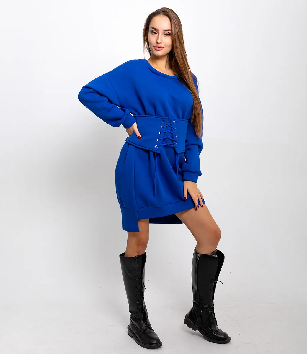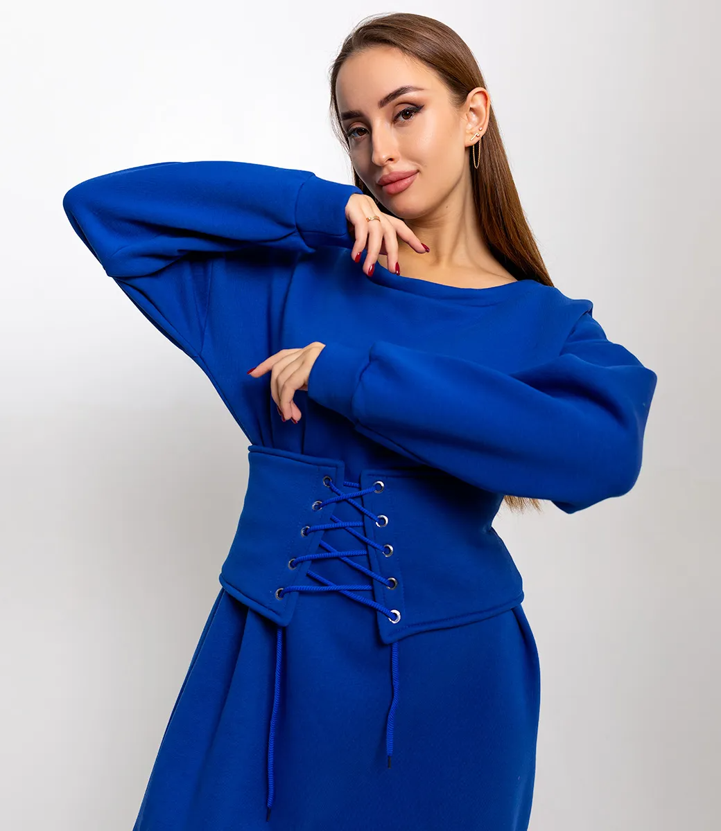 Стильное теплое платье благодаря модной длине идеально подходит для повседневного образа в прохладный сезон. Модель дополнена корсетом, который подчеркивает талию и придает образу красивый силуэт и женственность.