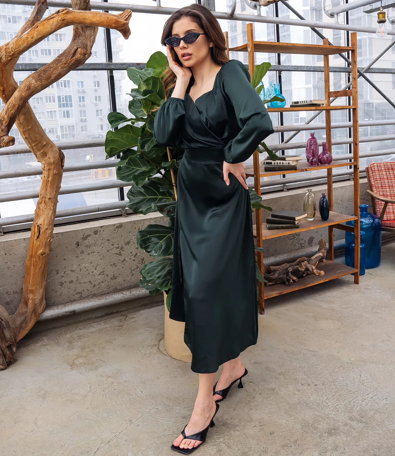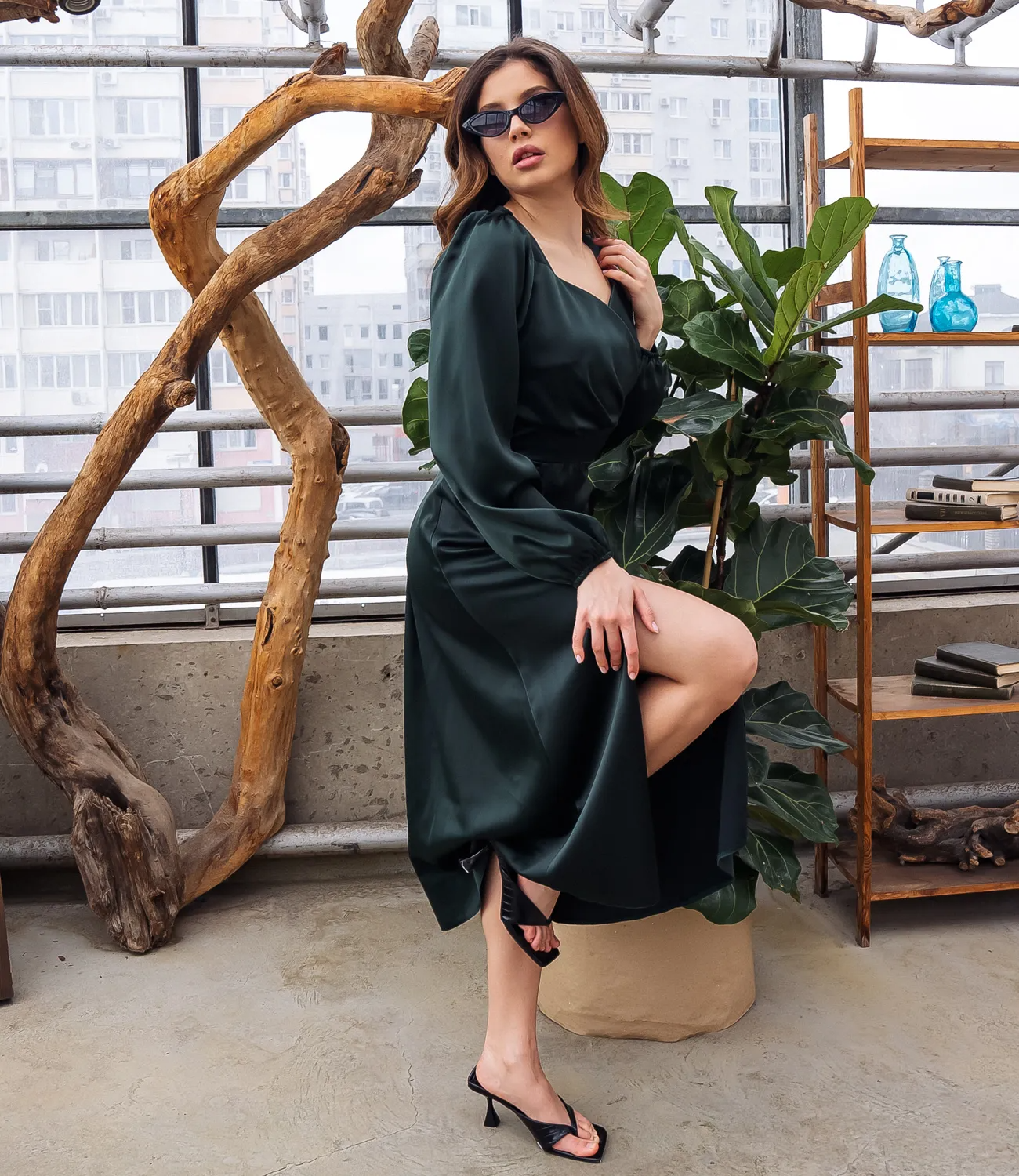 Комфортное и удобное платье модной длины миди придает образу одновременно скромности и женственности. Данная модель из атласа отлично сочетается с обувью на высоком и низком каблуке.