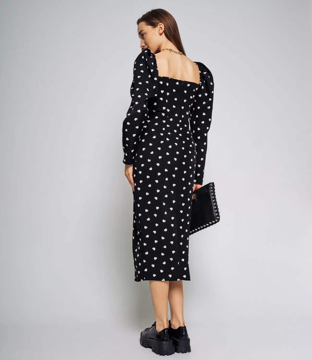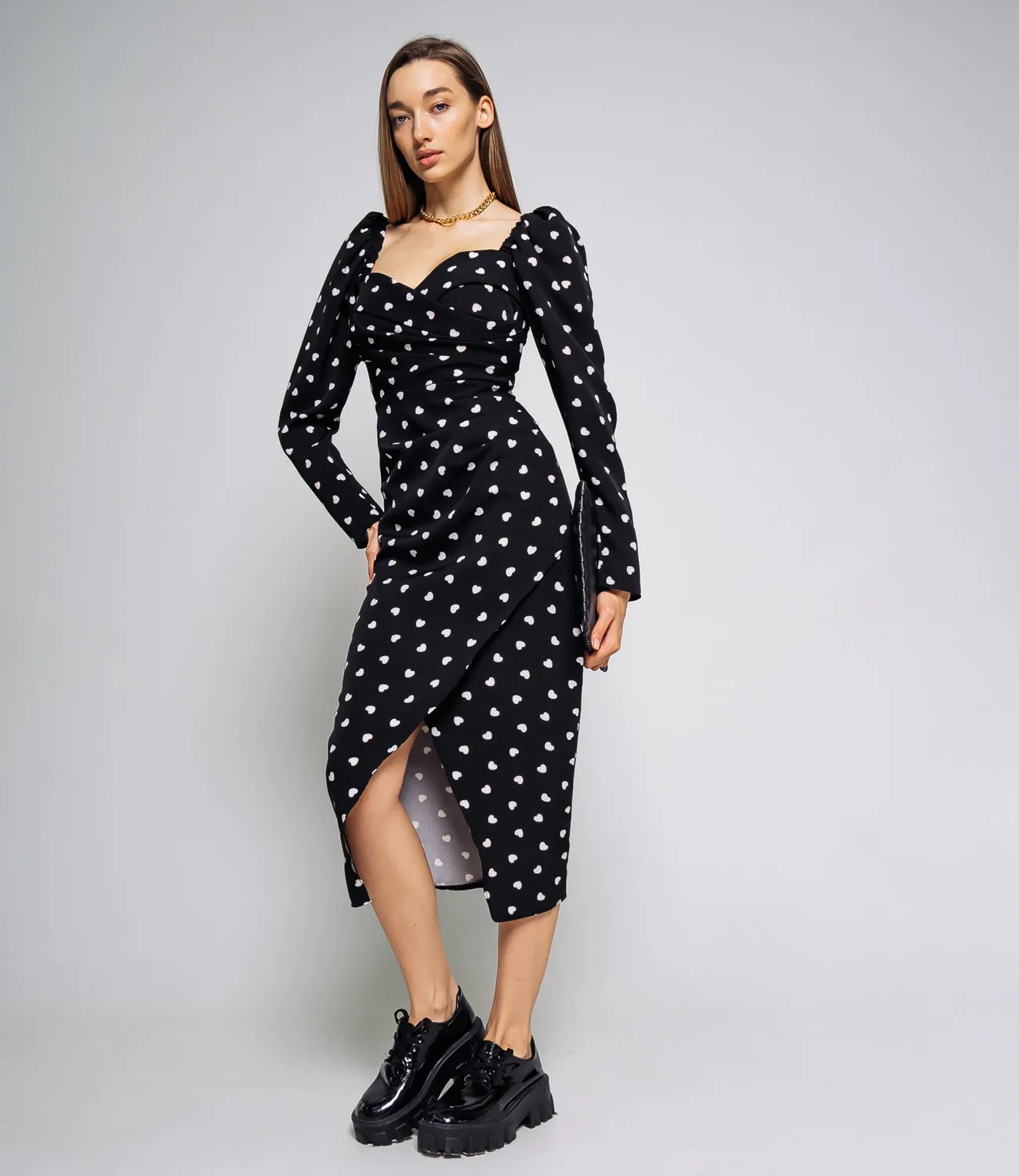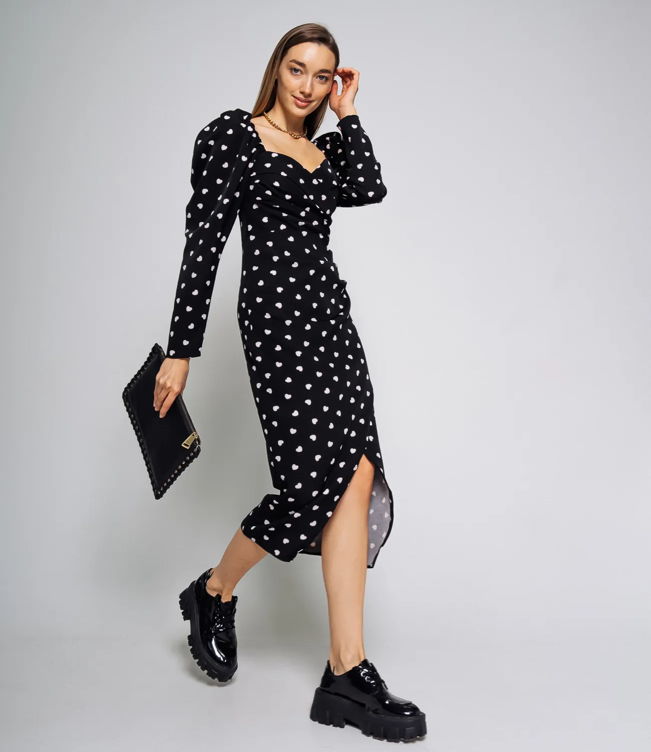 Нарядное облегающее платье, которое подчеркнет все достоинства фигуры. Небольшой разрез на ноге и аккуратное декольте добавит изюминку в образ.