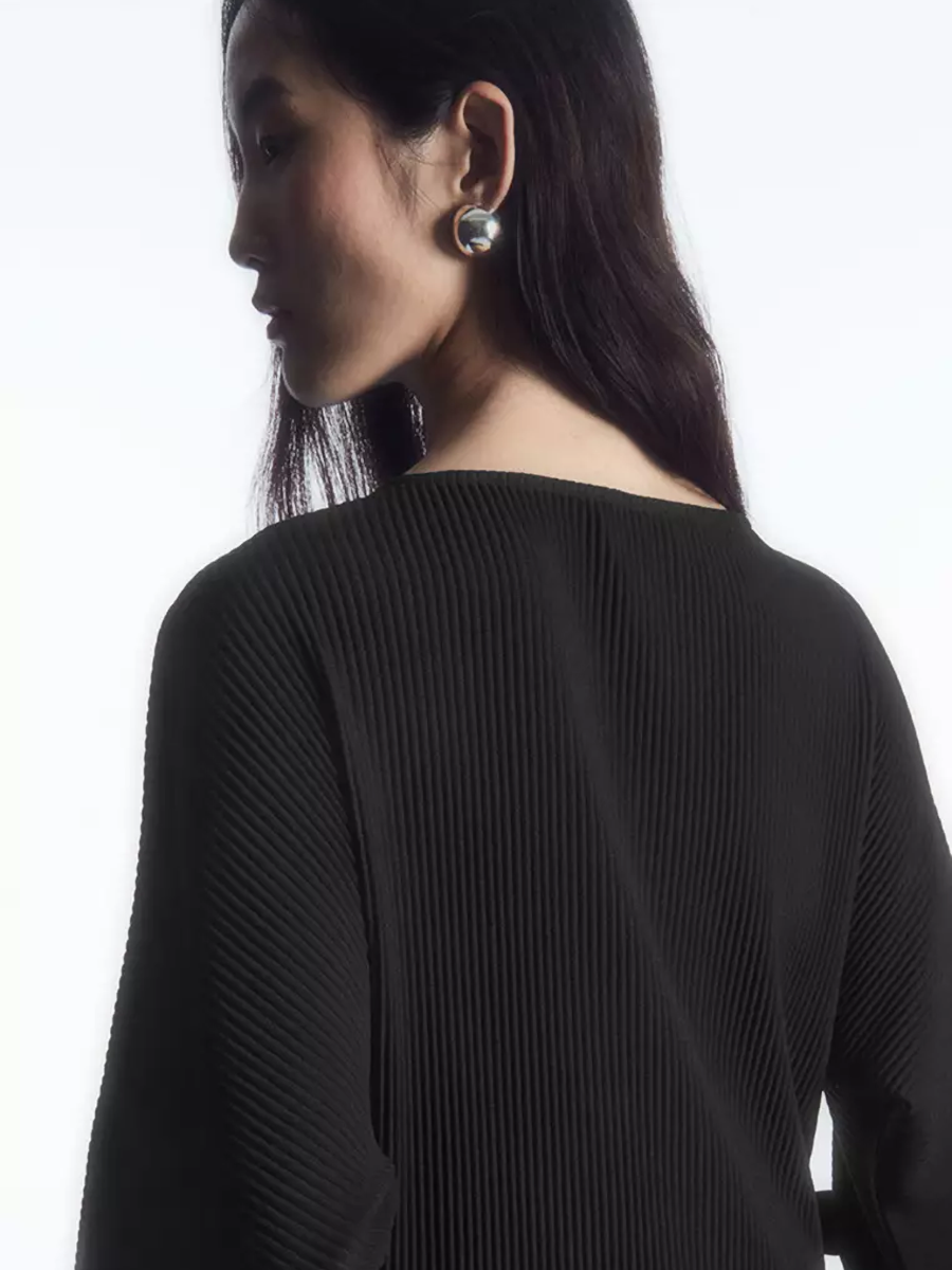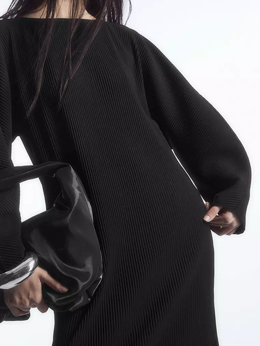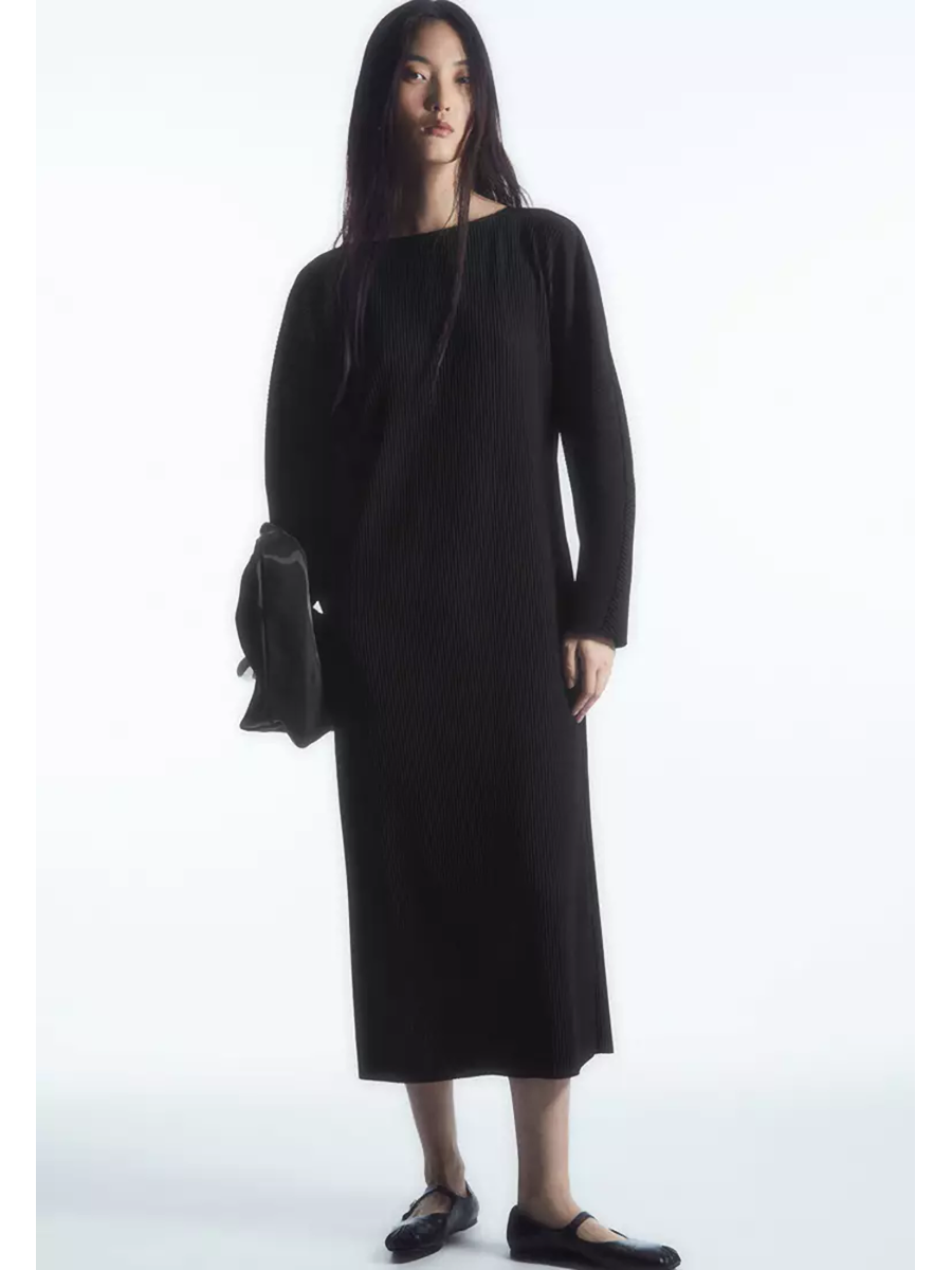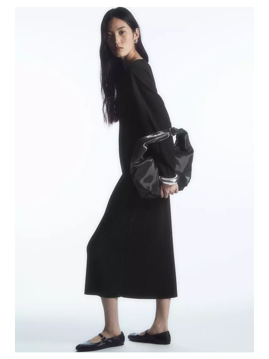 Команда COS по созданию женской одежды переосмыслила классическое платье для сезона осень-зима. Платье средней длины, изготовлено из переработанных волокон с добавлением эластана для плавной драпировки, с закругленными рукавами-дольманами.