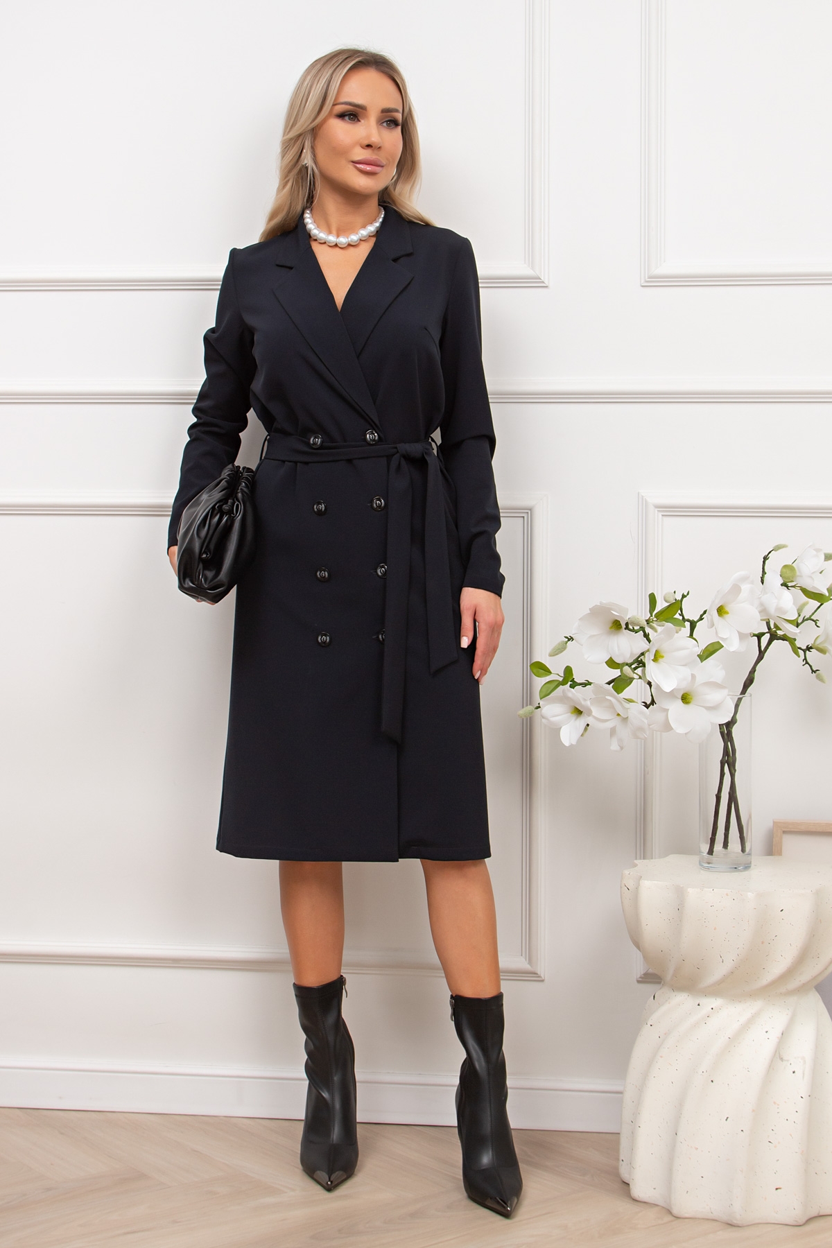 Элегантное платье прямого силуэта из костюмной ткани. Горловина с английским воротником. По переду выполнена двубортная застежка на петли и пуговицы. Длинный втачной рукав. Модель дополнена функциональными карманами в боковых швах. Низ ровный, без разрезов. Пояс из основной ткани в комплекте. Отличный вариант для офиса.