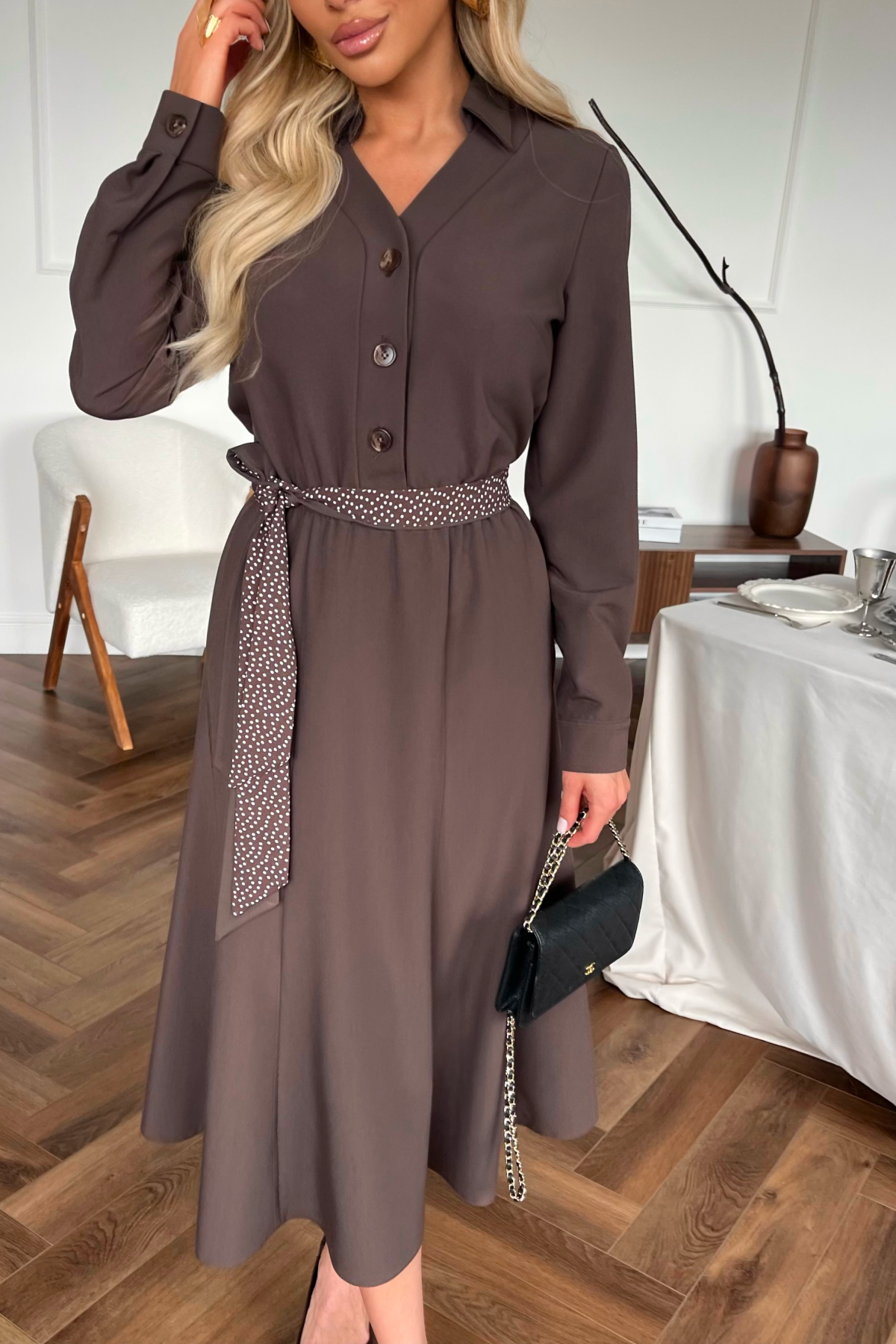 Повседневное платье приталенного силуэта из плательно-костюмной ткани.V-образная горловина оформлена отложным воротником на стойке. По переду планка с застежкой на петли и пуговицы. Длинный втачной рукав оформлен притачной манжетой. Юбка состоит из шести клиньев. В боковых швах функциональные карманы. Модель отрезная по линии талии присборена на резинку. Платье дополняет пояс с отделкой.