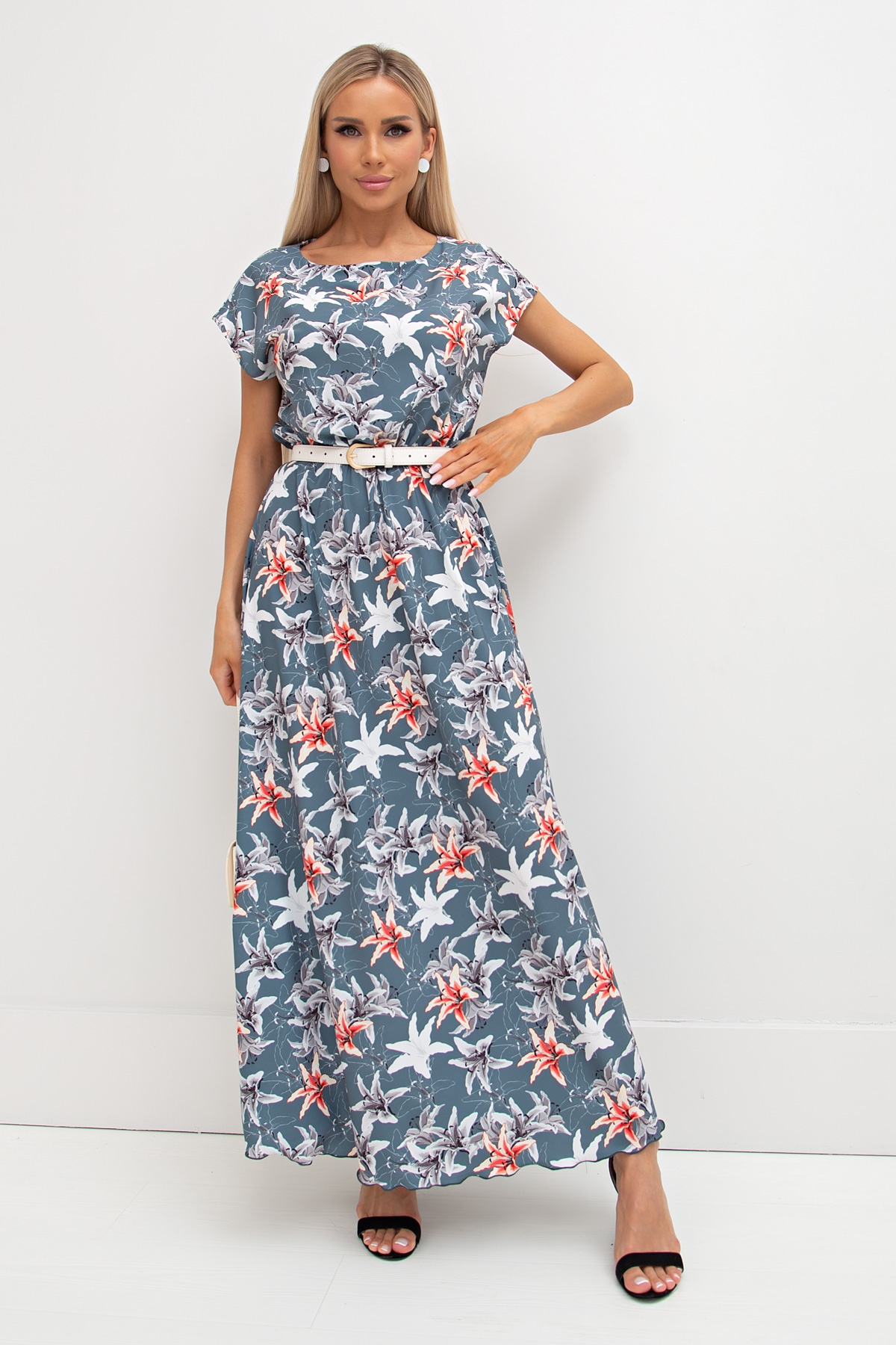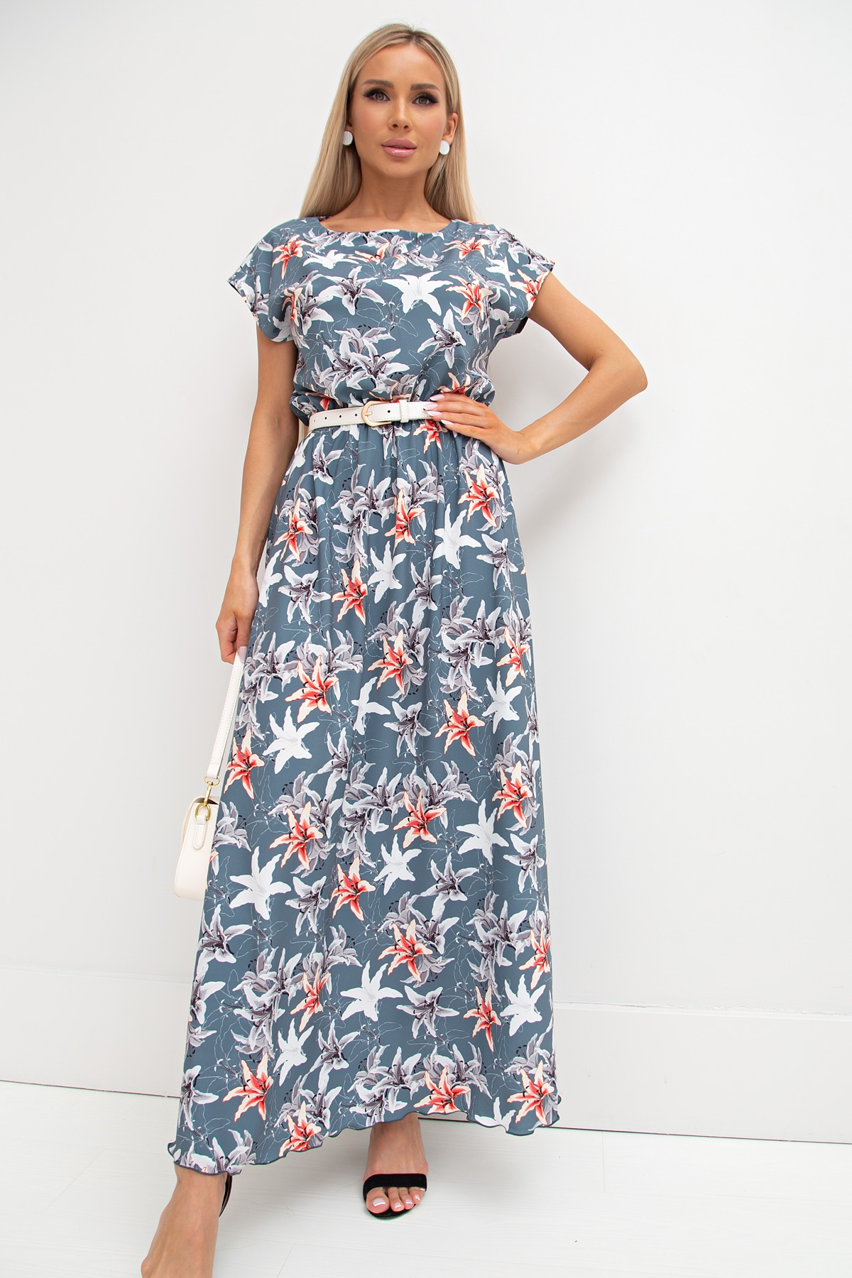 Воздушное платье полуприлегающего силуэта с цветочным принтом. Короткие спущенные рукава. Горловина на внутренней обтачке оформлена "лодочкой". Модель отрезная по талии, собрана на резинку. Низ ровный, без разрезов.