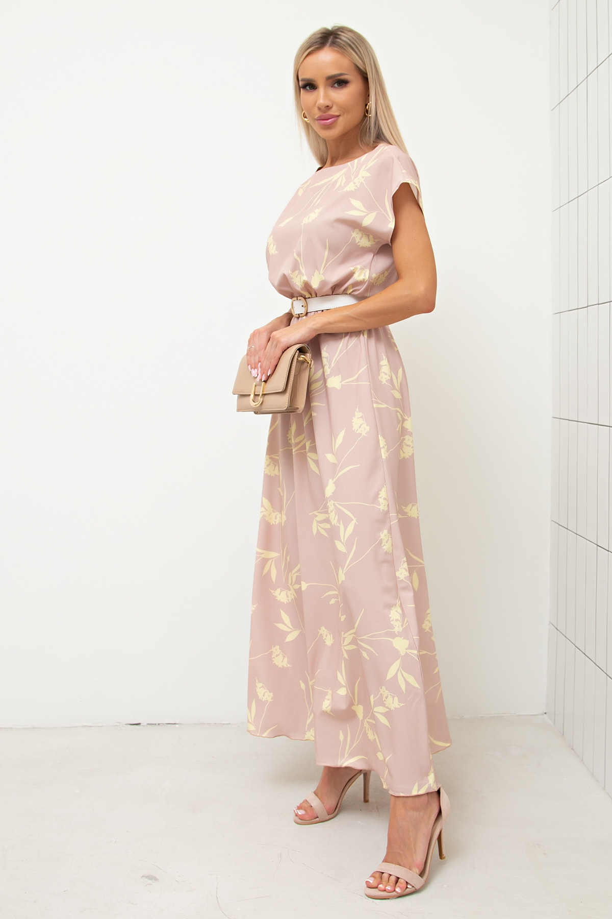 Воздушное платье полуприлегающего силуэта с цветочным принтом. Короткие спущенные рукава. Горловина на внутренней обтачке оформлена "лодочкой". Модель отрезная по талии, собрана на резинку. Низ ровный, без разрезов.