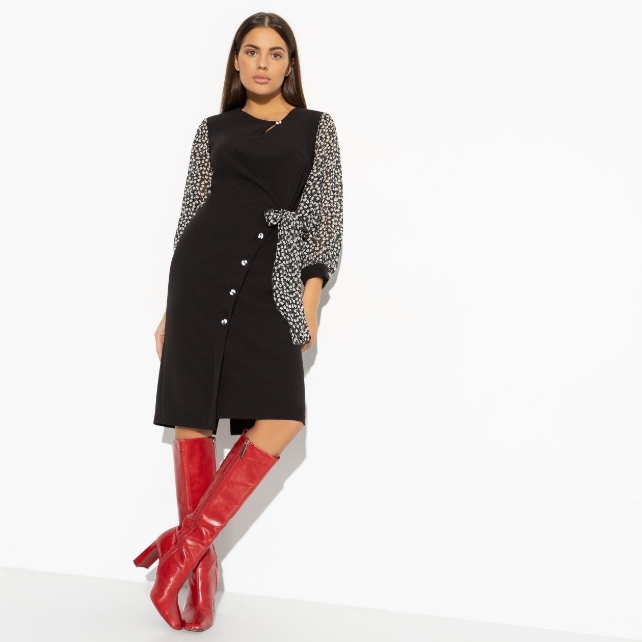 Однажды на уроке литературы много лет назад учитель попросила тебя раскрыть тему романтизма. Тебе понадобилось время. И вот, наконец, ты её раскрыла – в платье в черно-белой гамме с шифоновым бантом. Платье приталенного силуэта в длине миди. Запах и застежка сделаны по косой линии.