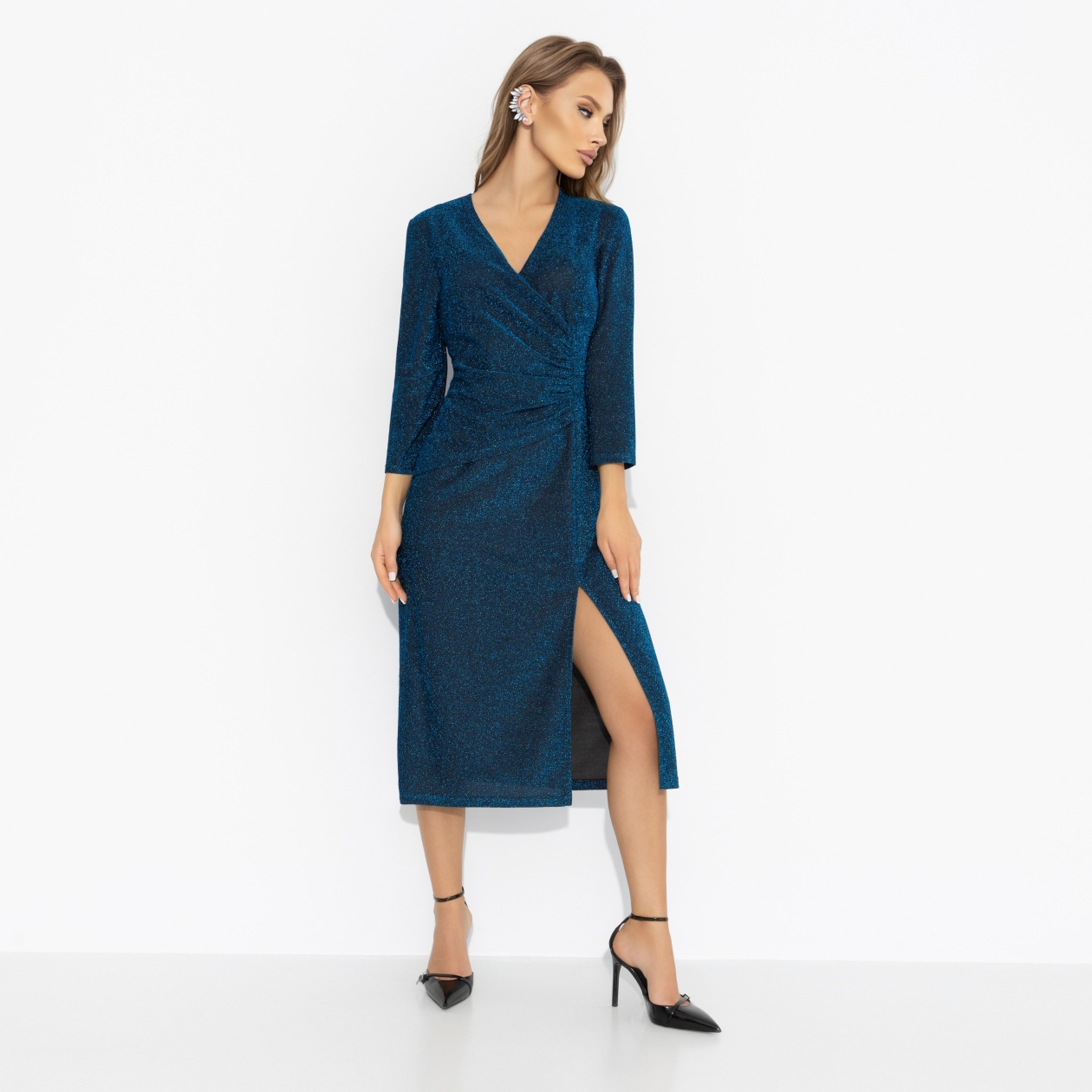 Сегодня звёзды подыгрывают вашим желаниям. В этом платье ЧАРУТТИ вы ‒ воплощение магии: притягиваете взгляды, открываете новые главы в своей натальной карте. Платье из эластичного трикотажа с люрексом: эффектный блеск, акцентный запах на талии и глубокий V-образный вырез. Прилегающий силуэт, высокий разрез для дерзких выходов. Для той, кто любит удивлять и верит в модные знаки судьбы!