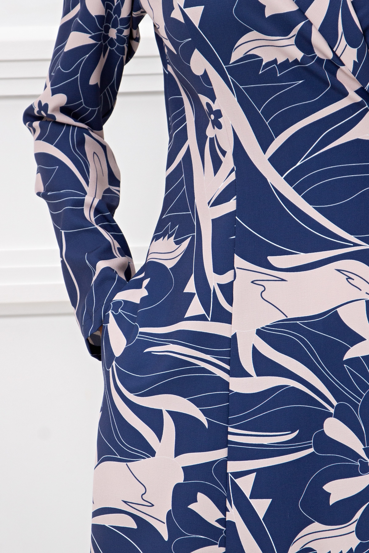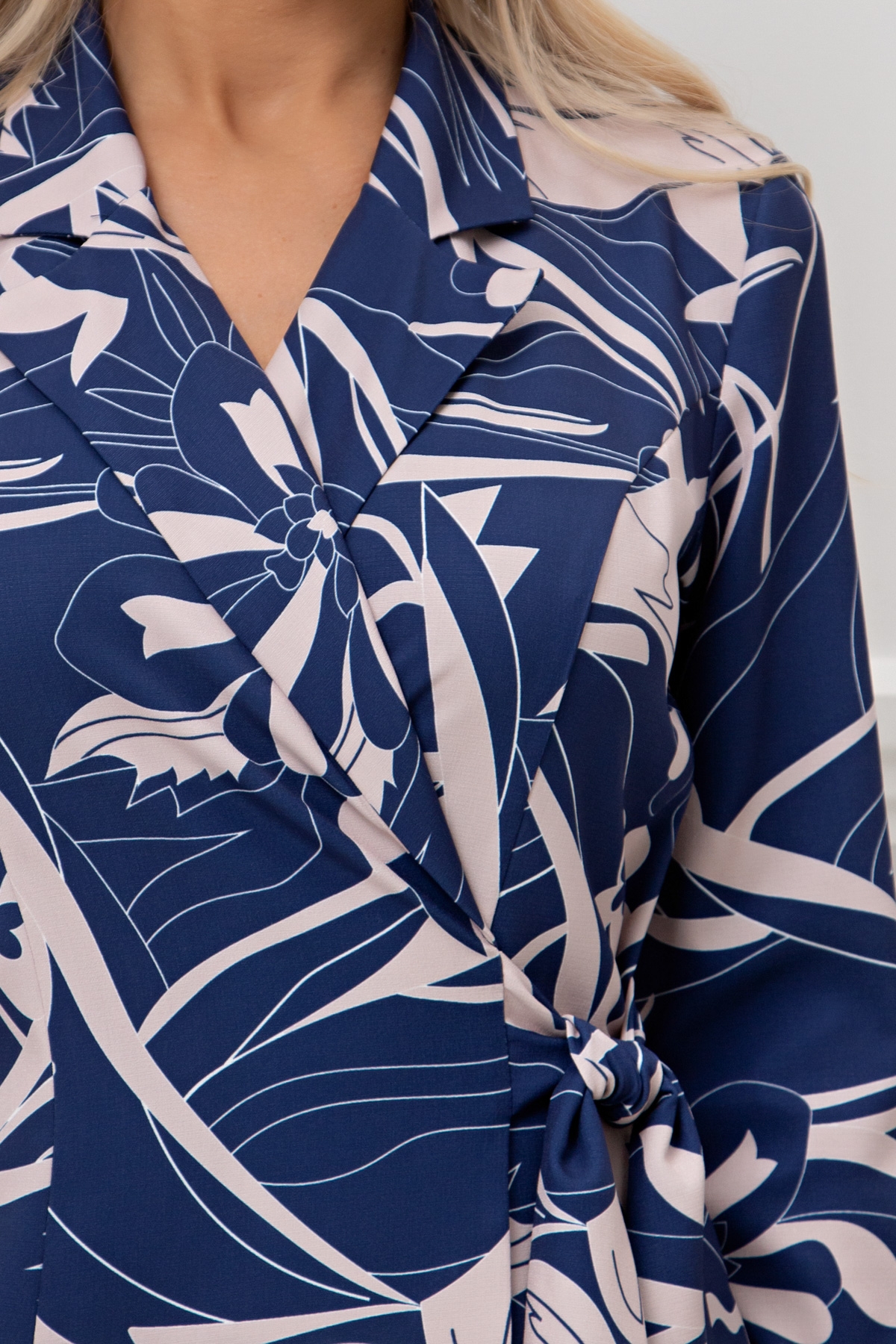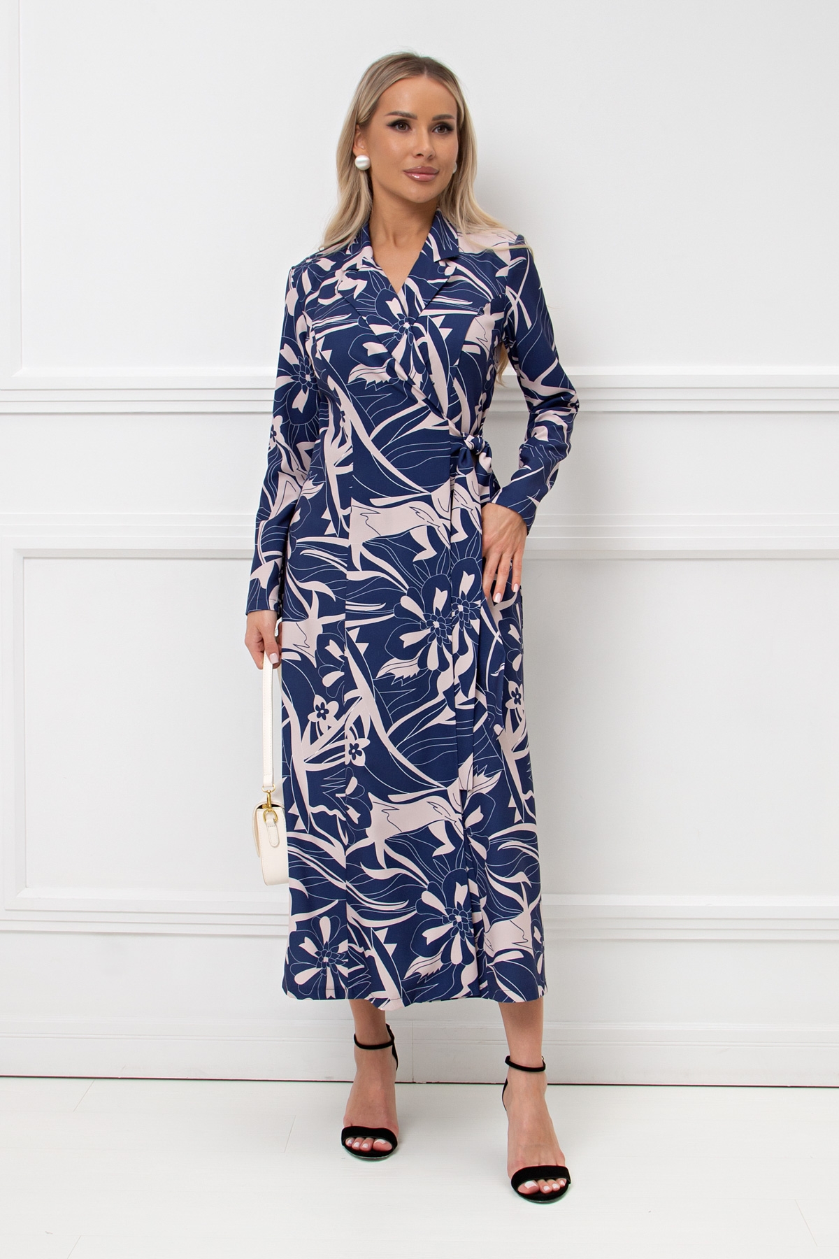 Комфортное платье на запахе, приталенного силуэта изготовлено из плательной ткани. Английский отложной воротник. Длинный втачной рукав. По линии талии пояс-завязка. В боковых швах функциональные карманы. Низ ровный, без разрезов.