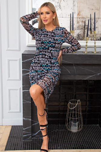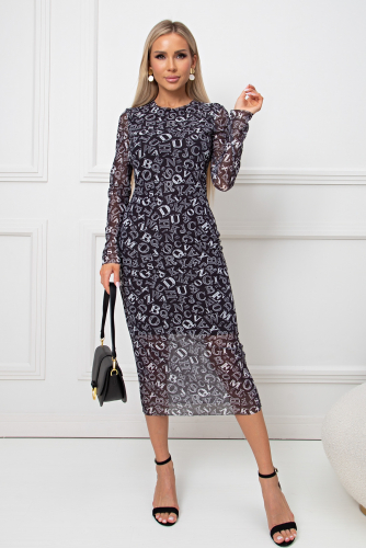 Платье прилегающего силуэта из трикотажной сетки на подкладке из трикотажного полотна. Края не обработаны. Длинный втачной рукав. Округлая горловина.