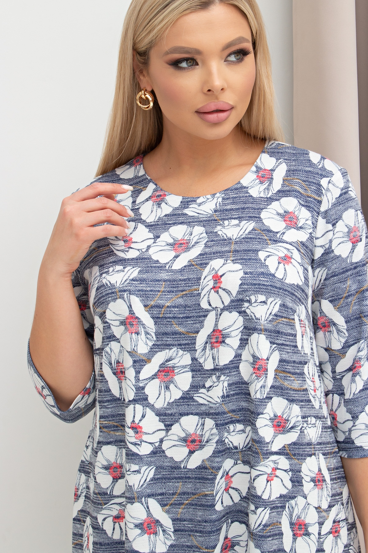 Элегантное платье А-образного силуэта из трикотажного полотна с оригинальным принтом. Втачные рукава ¾. Круглая горловина на внутренней обтачке. В заднем шве спинки – застежка на потайную молнию. Низ ровный, без разрезов.