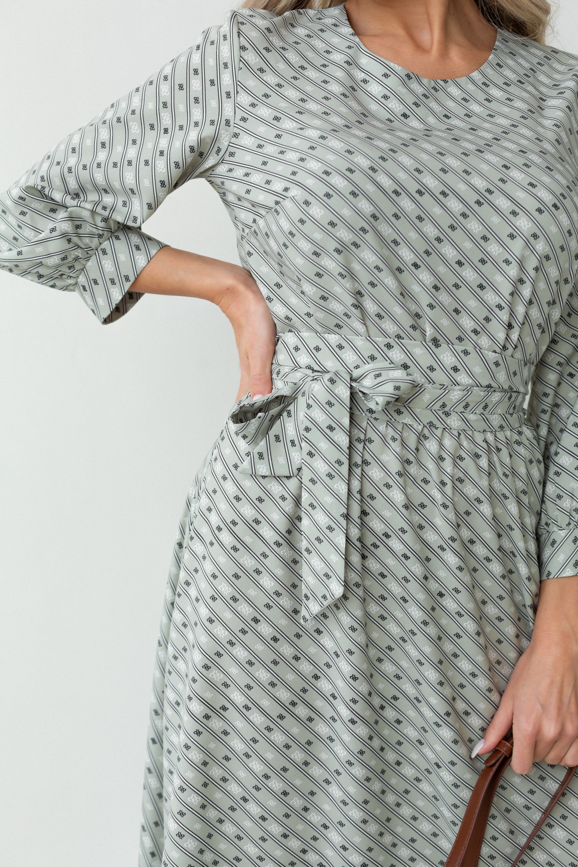 Красивое платье приталенного силуэта. Округлая горловина на внутренней обтачке, по спинке разрез - капелька с застежкой на петлю и пуговицу. Втачной рукав 3/4, оканчивается притачной манжетой. Модель отрезная по линии талии. По талии проложена эластичная резинка, что дополнительно подчеркнет Ваш силуэт. Пояс - кушак из основного материала в комплекте.