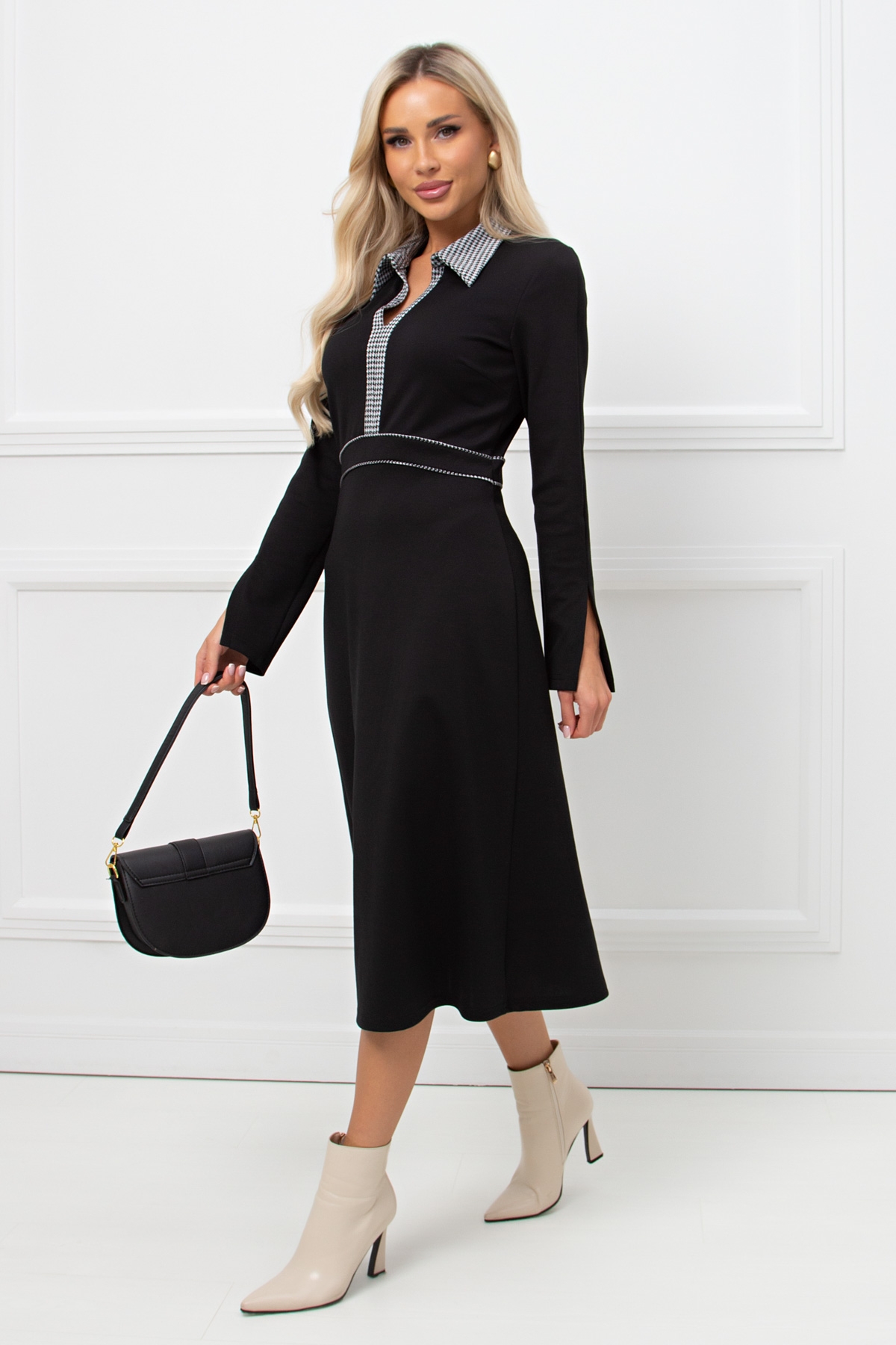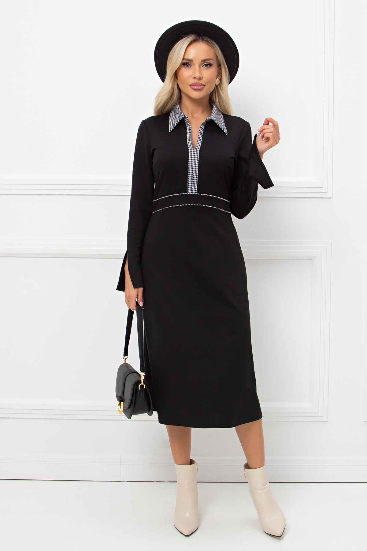 Элегантное платье приталенного силуэта из плотного трикотажного полотна. Контрастный отложной воротник на стойке переходящий в планку с разрезом. Длинные втачные рукава оформлены разрезами. Модель отрезная по линии талии, дополнена втачной кокеткой с контрастным кантом. Низ ровный, без разрезов.