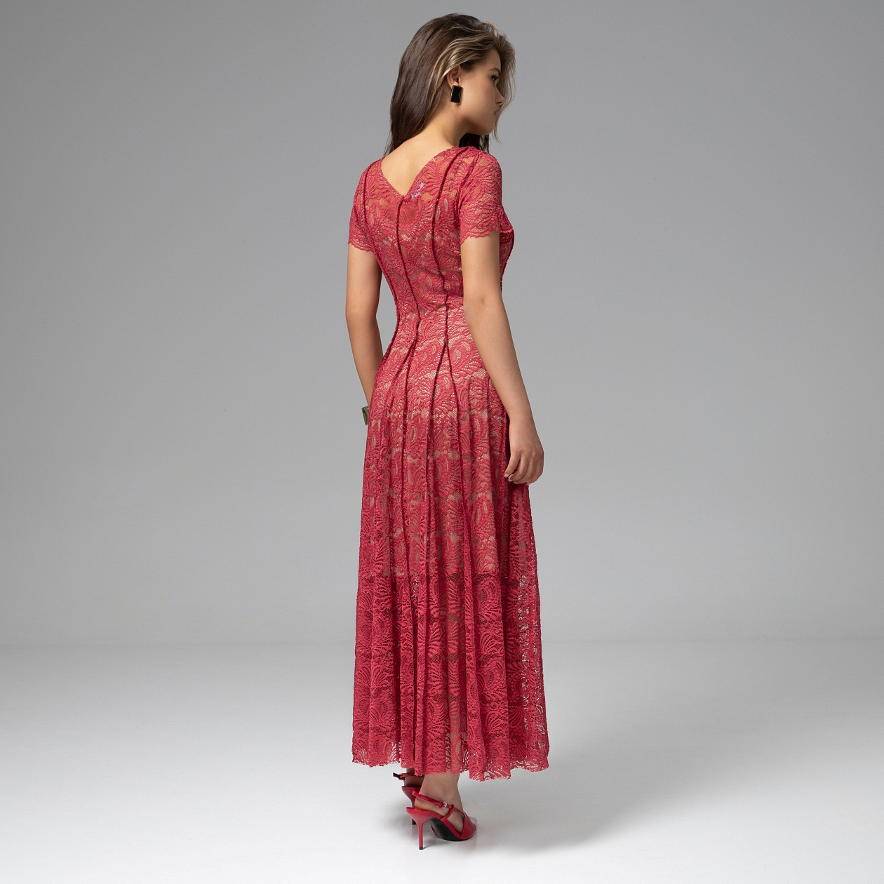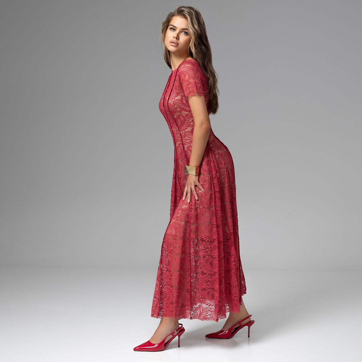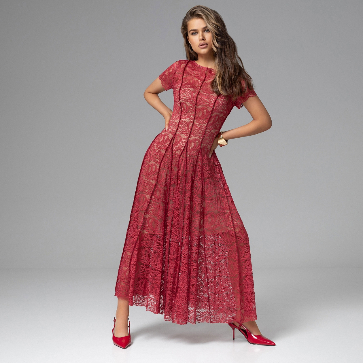Глубокий алый оттенок, дизайнерское кружево и безупречный силуэт создают редкий баланс – эмоция чувствуется, но остаётся благородно сдержанной. Платье «Сфотай меня немедленно» именно из таких. Кружевная фактура создаёт деликатную игру света и глубину рисунка. Трикотажный подклад обеспечивает комфортную посадку, а приталенный крой с плавным расширением юбки формирует вытянутый, элегантный силуэт. Модель создаёт эффект деликатной полупрозрачности без лишней откровенности. Вертикальные линии рисунка и плавное расширение юбки придают силуэту лёгкость и красивую динамику при движении. Стилисты ЧАРУТТИ советуют поддержать образ лаконичными лодочками и минималистичными украшениями. И страсть в этом образе звучит по-настоящему изысканно.