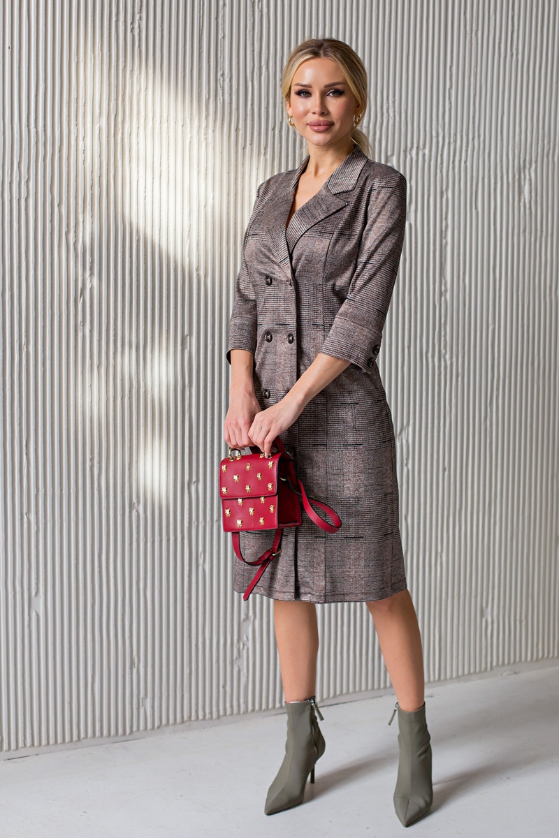 Стильное платье полуприлегающего силуэта выполненное из трикотажного полотна с принтом "клетка". V - образный вырез горловины с английским отложным воротником. Втачные рукава длинной 3/4 оканчиваются манжетой. По переду выполнена двубортная застежка на петли и пуговицы. Рельефы по полочке и спинке обеспечивает идеальную посадку по фигуре. В боковых швах функциональные карманы. Низ ровный, без разрезов.