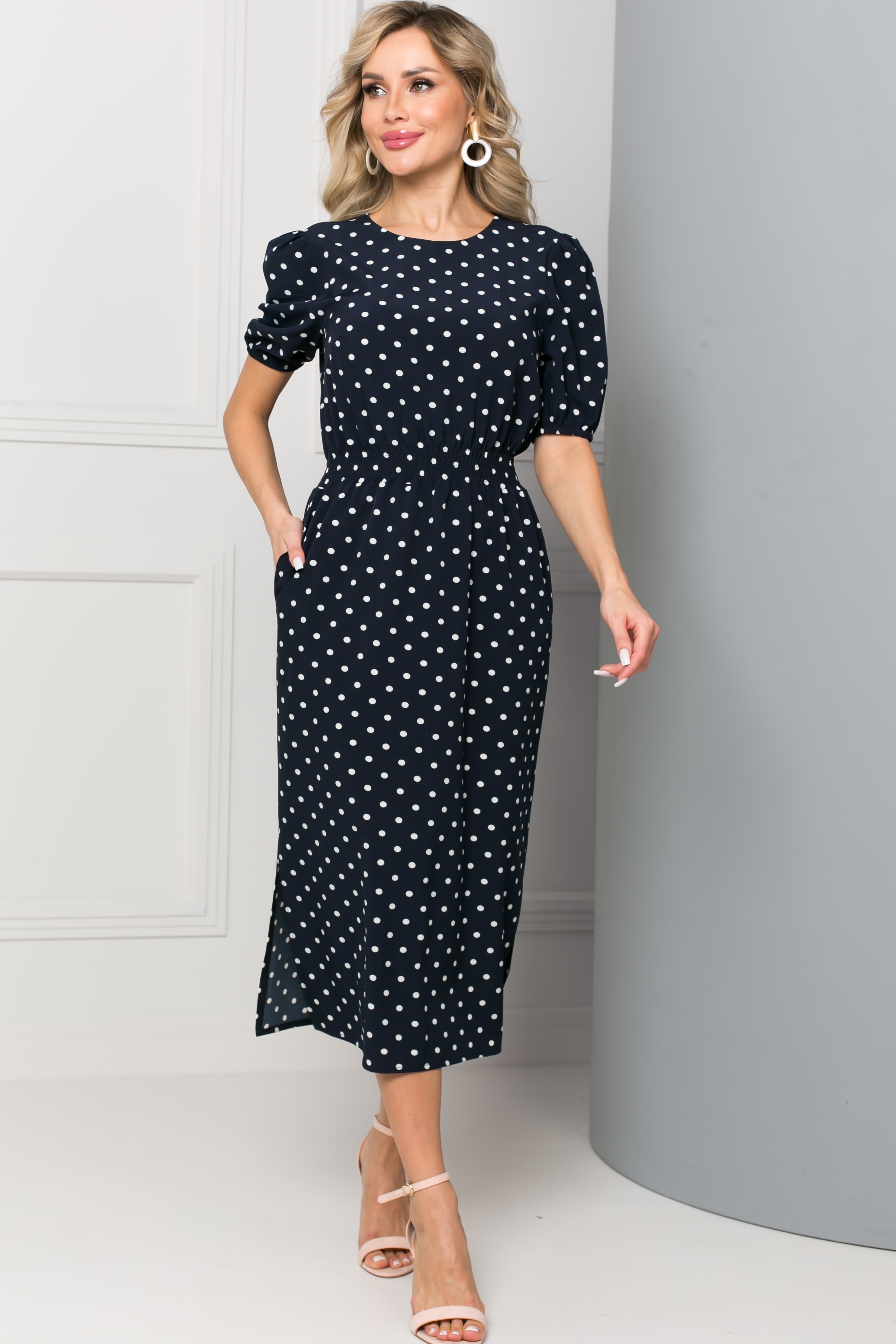 Красивое платье приталенного силуэта добавит Вашему образу женственности и шарма. Округлая горловина на внутренней обтачке с застежкой по спинке на петлю и пуговицу. Короткий втачной рукав - фонарик присборен на эластичную резинку. Модель отрезная по линии талии. В боковых швах функциональные карманы. По талии проложена эластичная резинка в несколько рядов, что дополнительно подчеркнет Ваш силуэт. Низ ровный, по бокам разрезы.