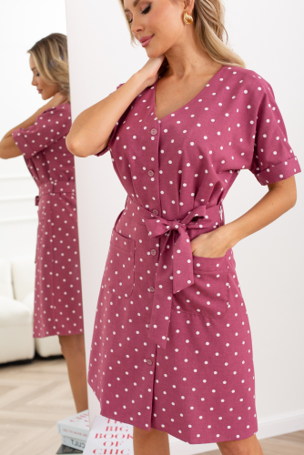 Стильное платье полуприлегающего силуэта. V-образный вырез горловины переходит в планку с застежкой на пуговицы. Цельнокроенные короткие рукава на манжетах с отворотами. Модель отрезная по линии талии, по спинке собрана на резинку. По переду выполнены защипы. Модель дополнена функциональными накладными карманами. Низ ровный, без разреза. Талию идеально подчеркивает пояс, завязывающийся в элегантный бант.