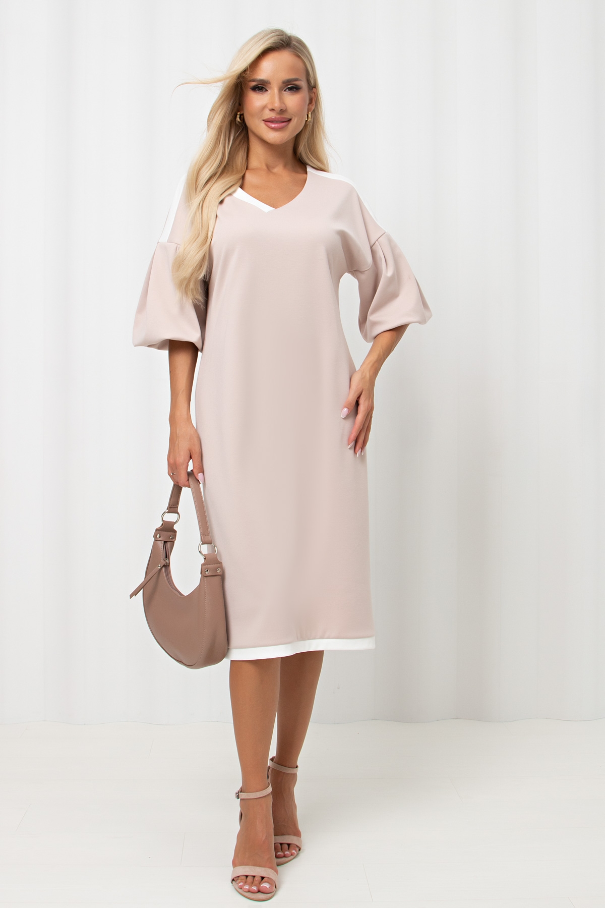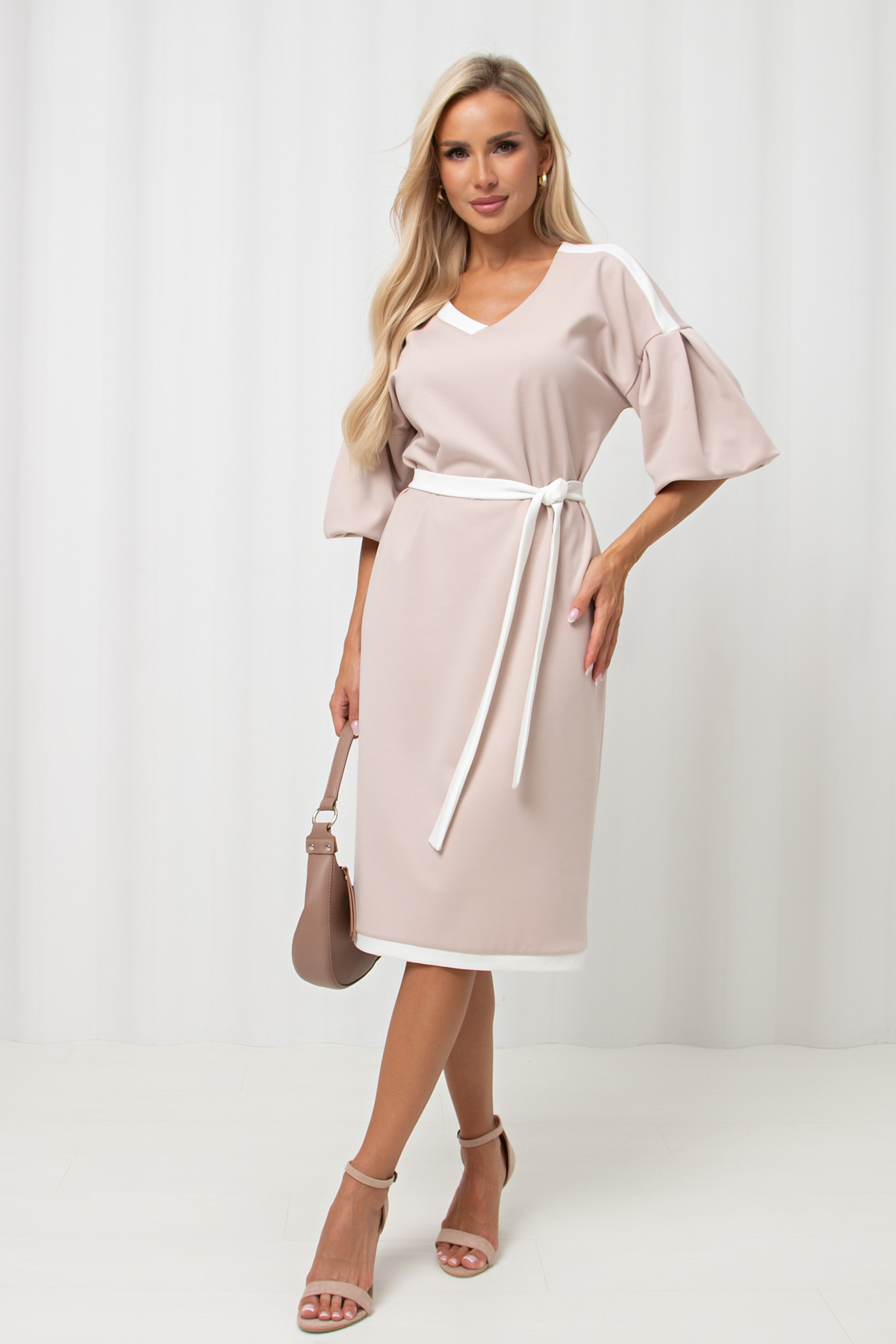 Женственное платье прямого силуэта. V - образная горловина на внутренней обтачке оформлена вставкой. Втачной рукав - фонарик со спущенным плечом. Низ ровный, оформлен притачной манжетой, сзади шлица. Пояс из основного материала входит в комплект.