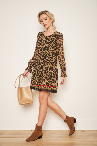 Очаровательное платье прямого силуэта из легкого полотна с леопардовым принтом. Длинные втачные рукава оканчиваются манжетами, собранными на шпульную резинку. Круглая горловина на внутренней обтачке. Низ оформлен широким воланом на сборке. Модель на подкладе. Низ ровный, без разрезов. Без застежки.