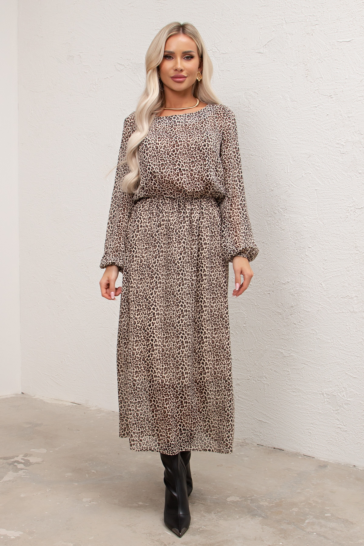 Женственное платье приталенного силуэта выполнено из креп-шифона. Округлая горловина на внутренней обтачке. Длинный втачной рукав присобран на эластичную резинку. Модель отрезная по линии талии, присобрана на резинку. Юбка на подкладке. Низ ровный, без разрезов.
