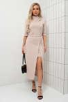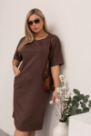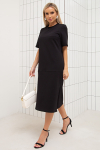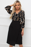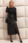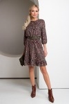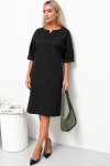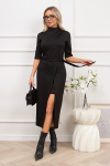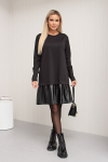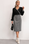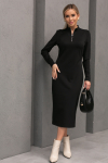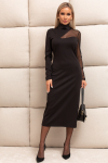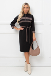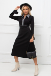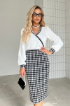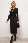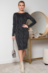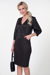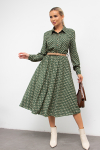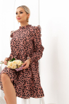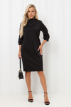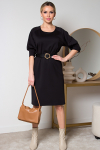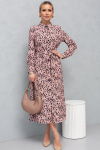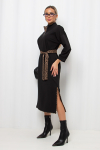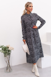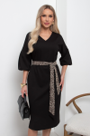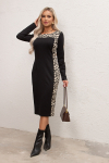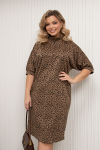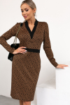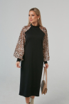 Элегантное платье прямого силуэта из плотного трикотажного полотна. Горловина оформлена воротником-стойка, переходящим в планку с леопардовым принтом. Длинный втачной рукав со спущенным плечом дополнен патой. Низ ровный, без разрезов. Пояс из основной ткани в комплекте.