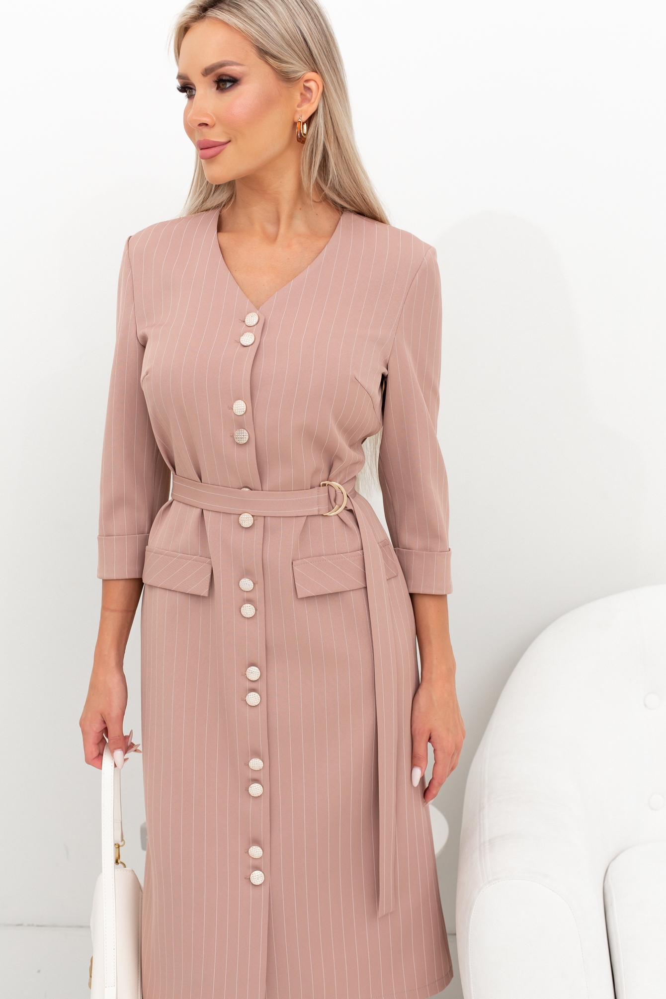 Платье прямого силуэта. V - образная горловина на внутренней обтачке. По переду застежка на петли и пуговицы. Втачной рукав длинной 3/4, оканчивается притачной манжетой с отворотом. Перед дополнен накладными клапанами. Пояс из основной ткани входит в комплект. Низ ровный, без разрезов.