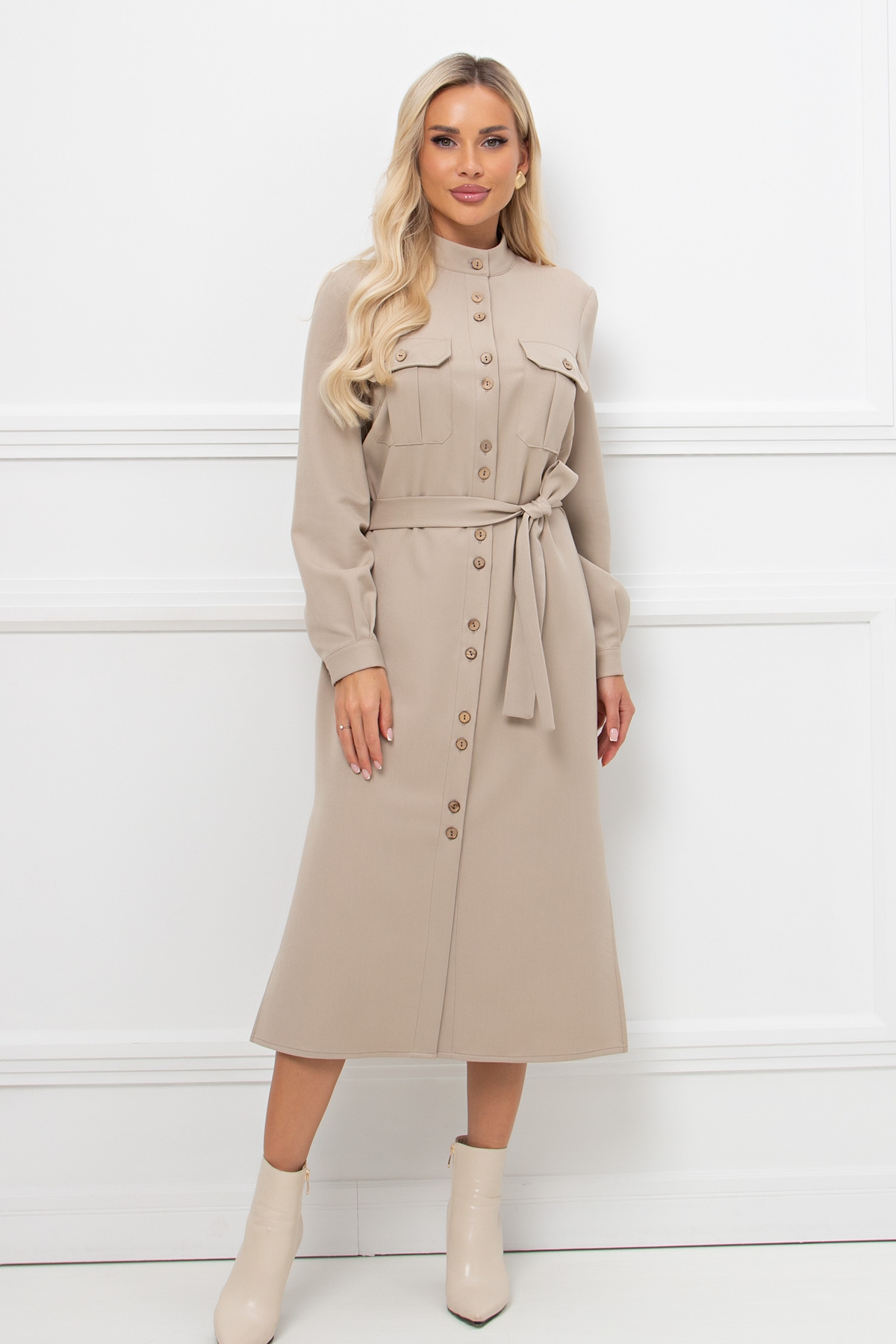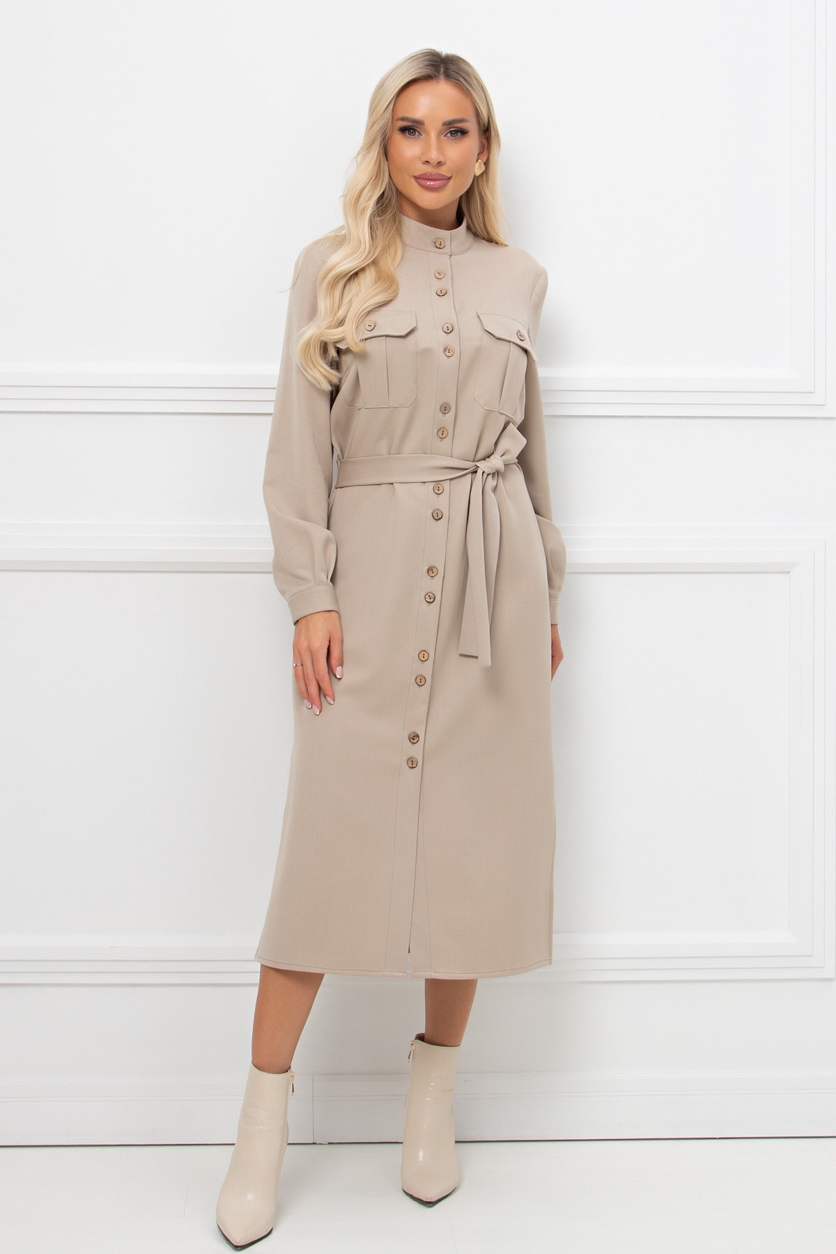 Стильное платье - рубашка прямого кроя. Горловина оформлена воротником - стойкой. По переду застежка на петли и пуговицы. Перед дополнен накладными карманами со складкой и клапаном. Длинный втачной рукав оканчивается притачной манжетой. Низ прямой, по бокам разрезы. Пояс из основного материала входит в комплект.