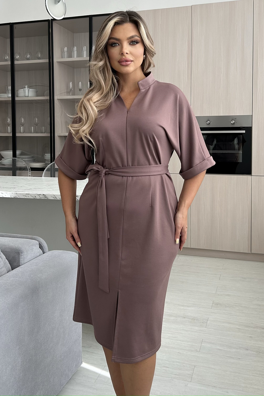Комфортное платье полуприлегающего силуэта изготовлено из трикотажного полотна. V-образная горловина оформлена воротником-стойка. Короткий цельнокроеный рукав оформлен притачной манжетой с отворотом. Модель отрезная по линии талии. В среднем шве по переду застежка на потайную молнию. Низ ровный, по переду разрез. Пояс из основной ткани в комплекте.