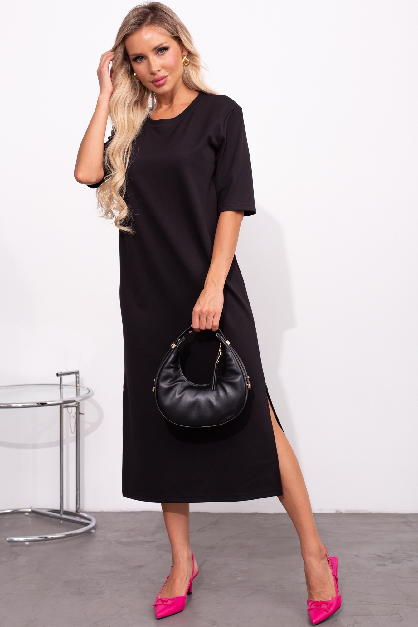 Комфортное платье прямого силуэта из трикотажного полотна. Округлая горловина на внешней обтачке. Короткий втачной рукав со спущенным плечом. Низ ровный, по бокам разрезы.