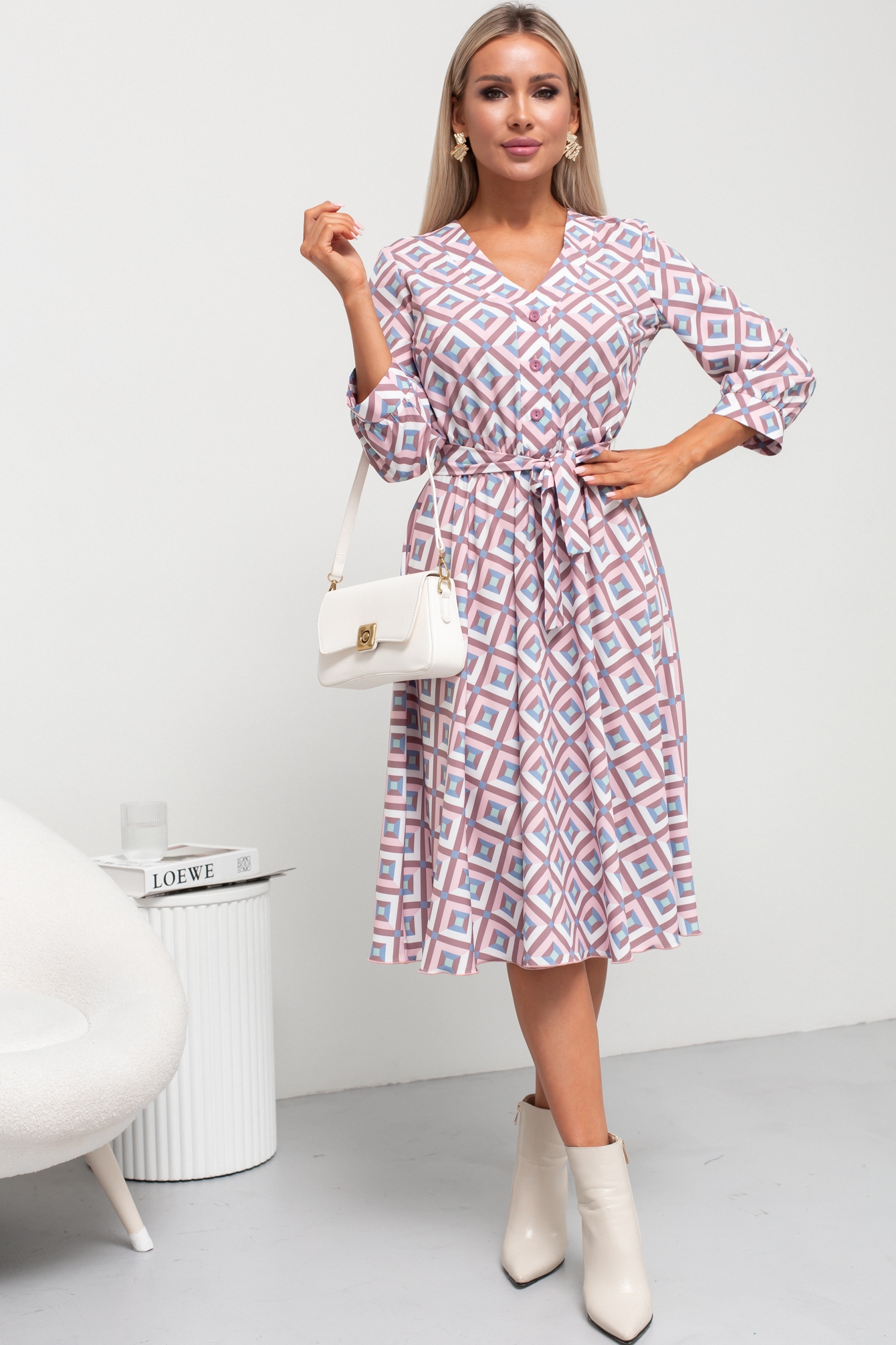 Красивое платье приталенного силуэта из легкой ткани Ниагара. V - образная горловина на внутренней обтачке переходящая в планку с застежкой на петли и пуговицы. Втачной рукав 3/4, присборен на манжету. Модель отрезная по линии талии, присобрана на резинку. Пояс из основного материала в комплекте.