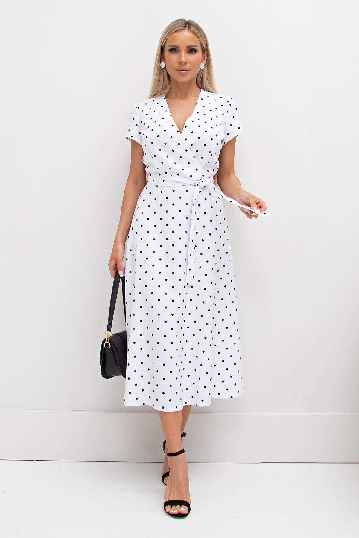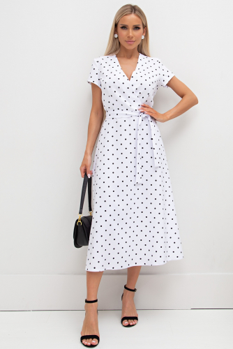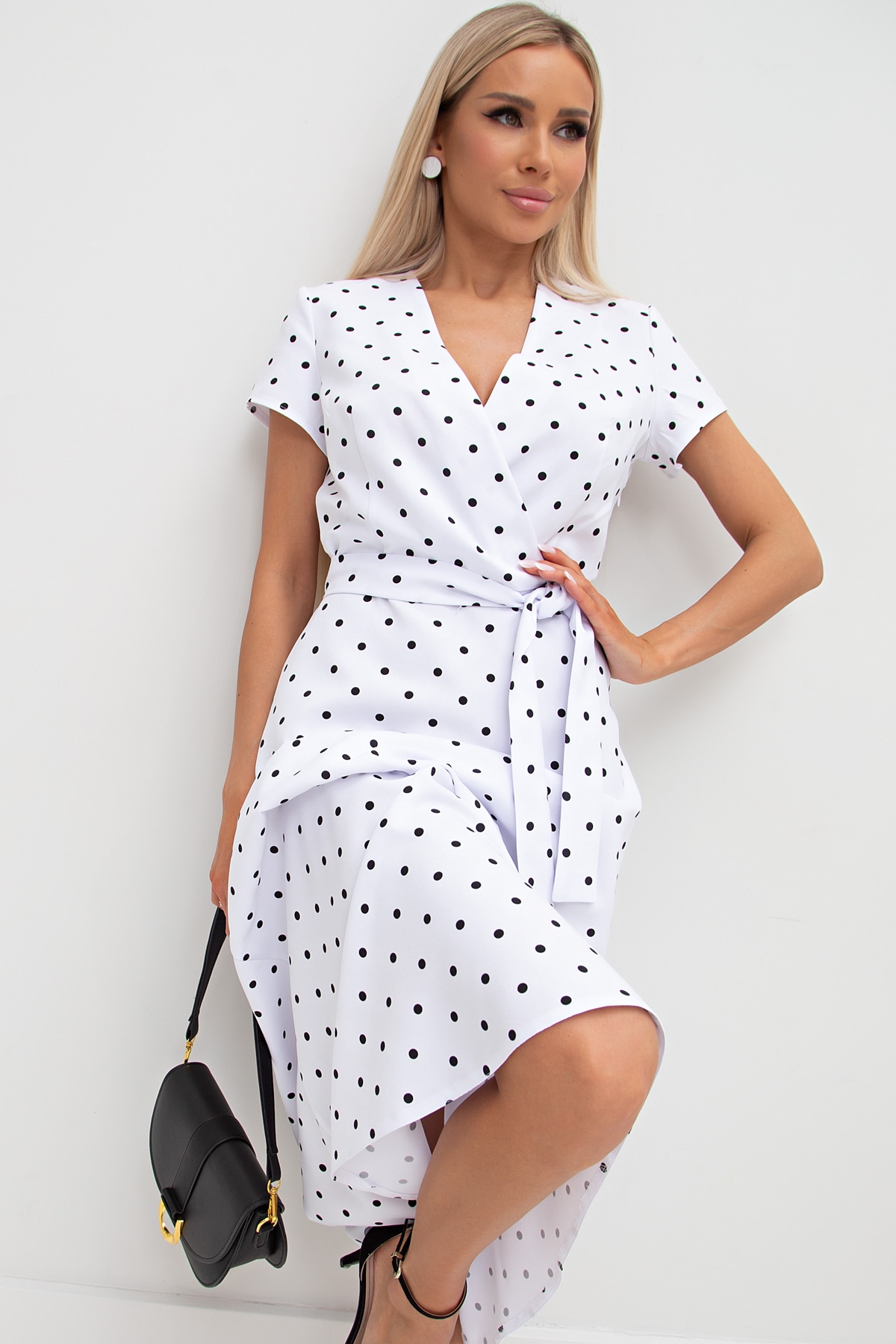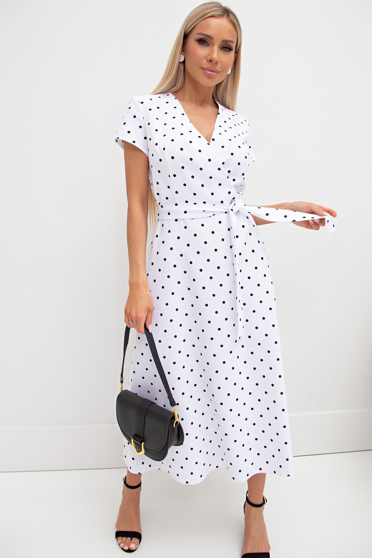 Комфортное платье приталенного силуэта. V - образная горловина на внутренней обтачке переходящая в запах. Короткий втачной рукав. Модель отрезная по линии талии, сбоку застежка на потайную молнию.  Низ ровный, без разрезов. Пояс из основного материала в комплекте.