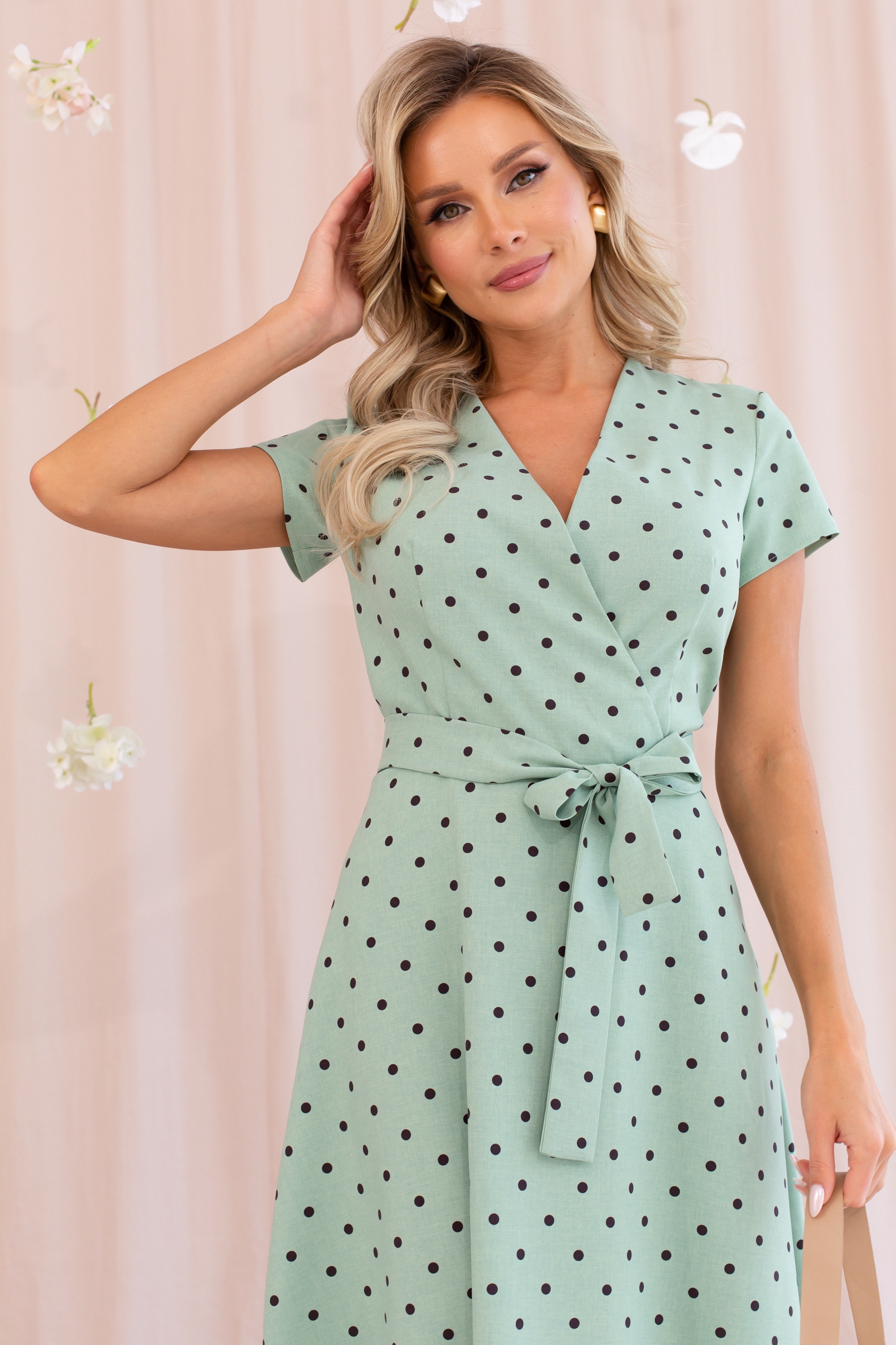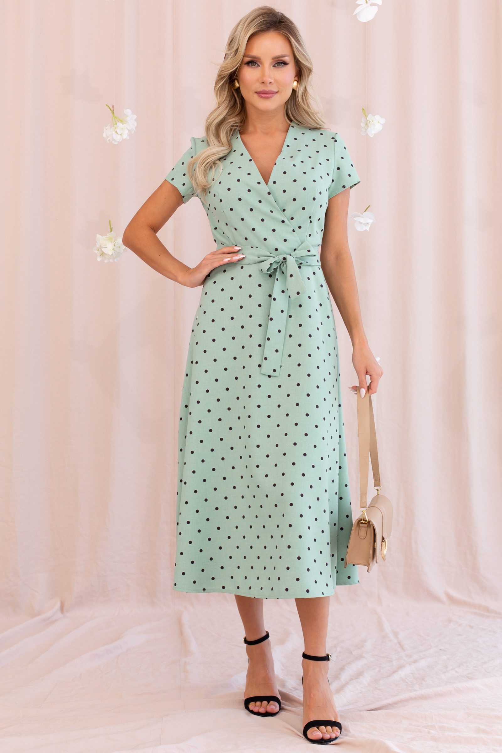 Комфортное платье приталенного силуэта. V - образная горловина на внутренней обтачке переходящая в запах. Короткий втачной рукав. Модель отрезная по линии талии, сбоку застежка на потайную молнию.  Низ ровный, без разрезов. Пояс из основного материала в комплекте.