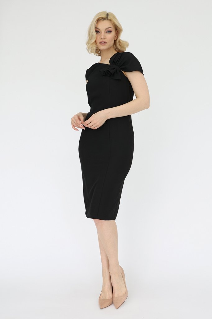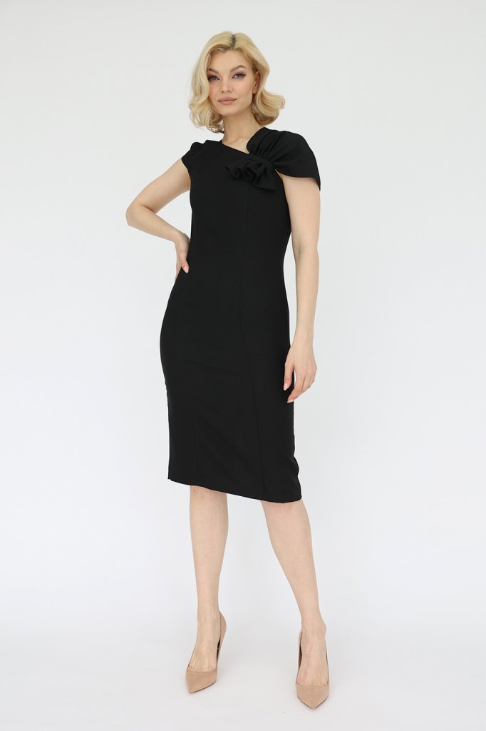 Платье-футляр с ассиметричным драпированным плечом шлицей и застежкой на молнию в среднем шве спинки.