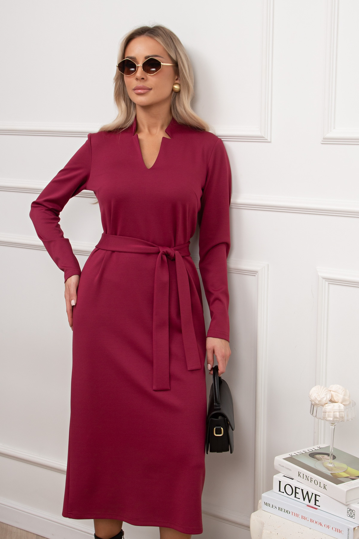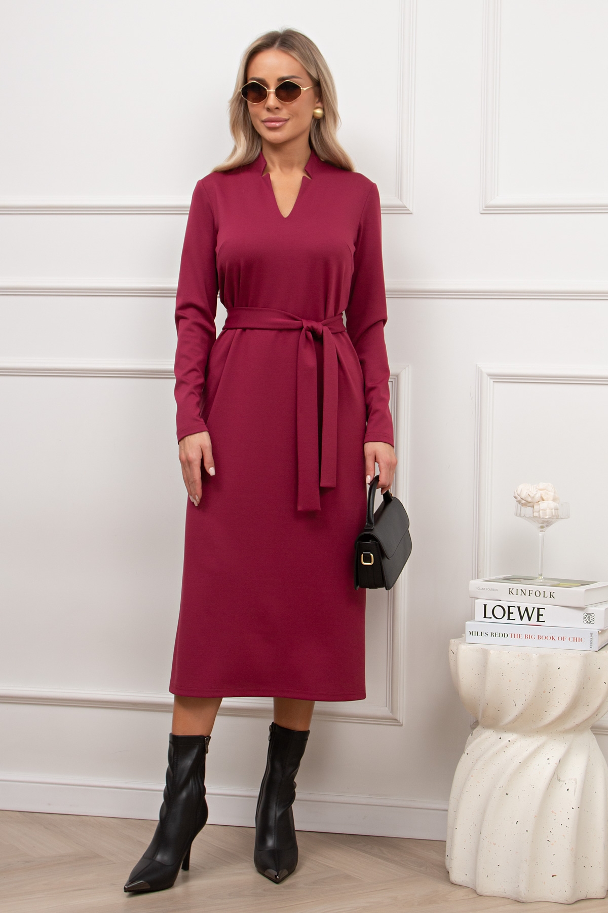 Лаконичное платье прямого силуэта изготовлено из трикотажного полотна. V-образная горловина с цельнокроеной стойкой. Длинный втачной рукав. Низ прямой, сзади шлица. Пояс из основной ткани в комплекте.