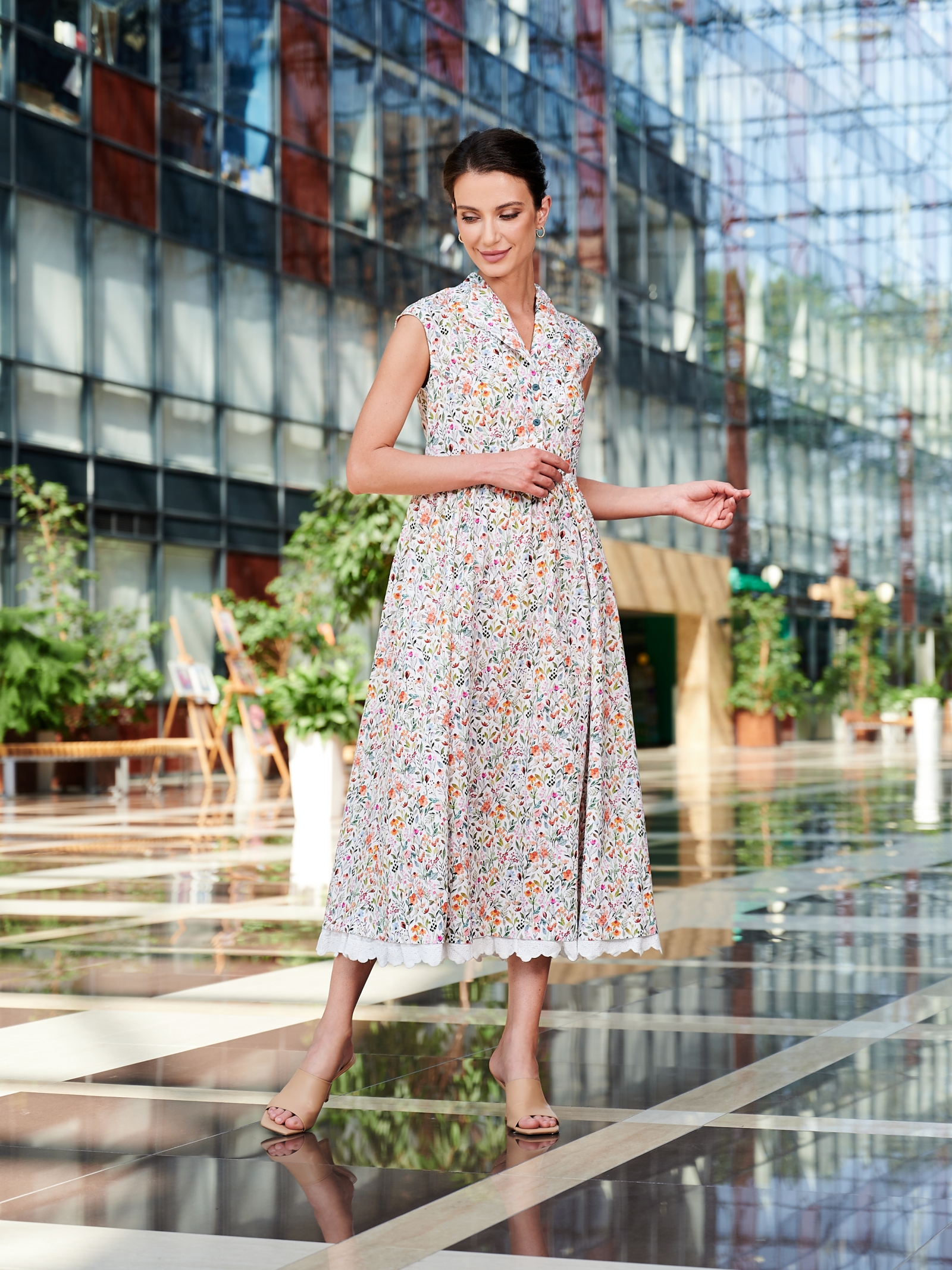Платье из хлопка с принтом полоса и цветок. Воротник апаш. Удлиненная линия плеча. Отрезное по талии, юбка в сборку. Карманы в боковых швах. По низу изделия кружево. Застежка на петли и пуговицы по центру полочки и потайная молния в боковом шве. Рост модели 170 см. Изделие на модели 42 р-ра. Длина изделия по спинке 128.5 см. Деликатная стирка при 30 градусах.