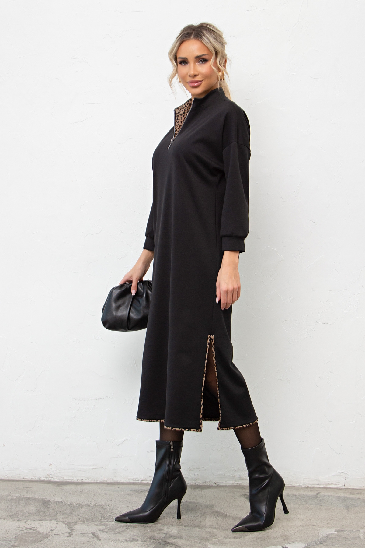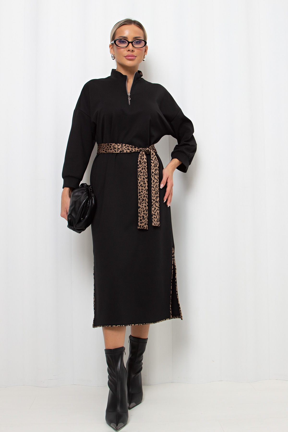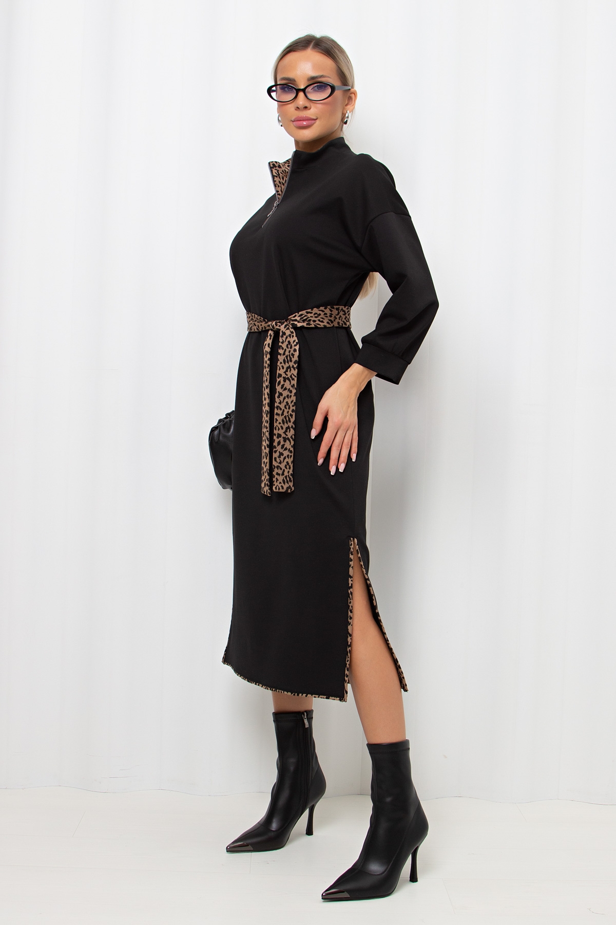 Элегантное платье прямого силуэта из плотного трикотажного полотна. Горловина оформлена воротником-стойка с застежкой на молнию, внутренняя обтачка выполнена из трикотажа с леопардовым принтом. Втачной рукав длиной 7/8 со спущенным плечом, оканчивается притачной манжетой. Низ и разрезы по бокам декорированы окантовкой. Пояс из отделочной ткани с принтом "леопард" входит в комплект.