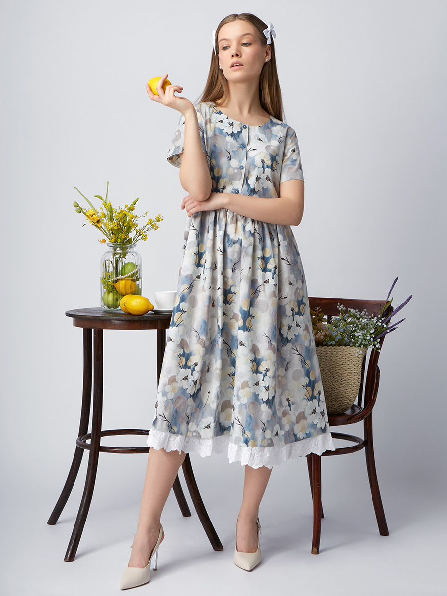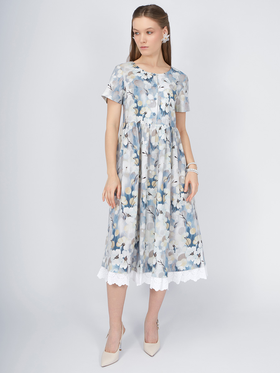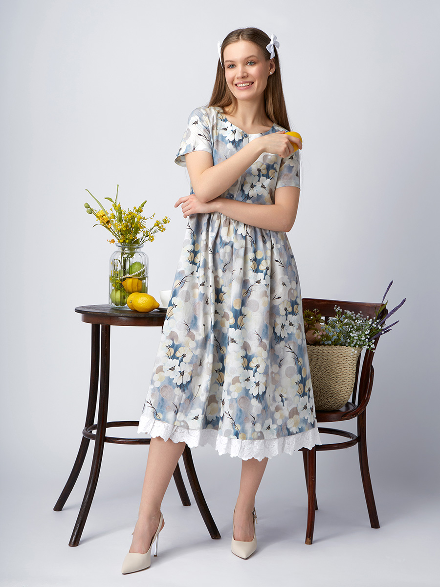 Платье прямого силуэта с расширением к низу из хлопка с цветочным принтом. Круглый вырез горловины. Рукав втачной, короткий. Отрезная юбка по линии талии со сборкой, и кружевом по низу. Карманы в боковых швах. Застежка по центру лифа полочки на петли и пуговицы. Рост модели 170 см. Изделие на модели 42 р-ра. Длина изделия по спинке 113,2 см. Деликатная стирка при 30 градусах.