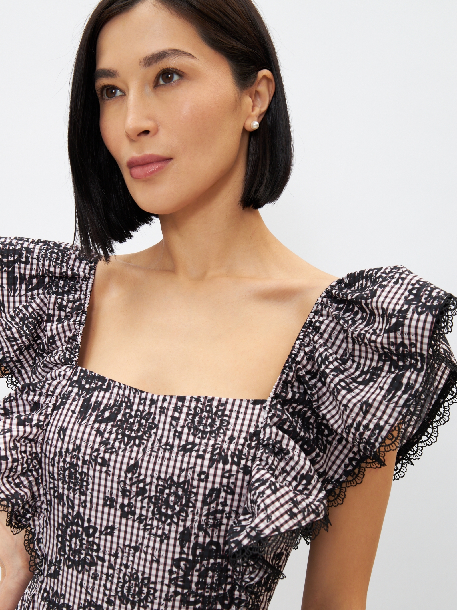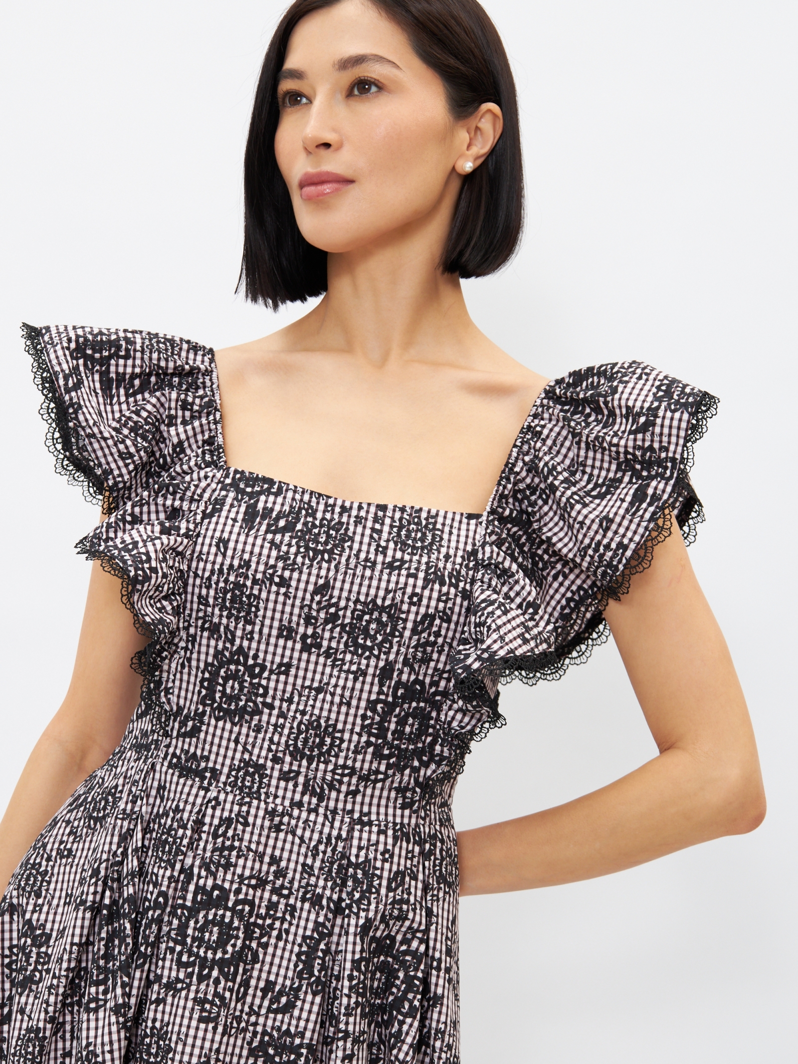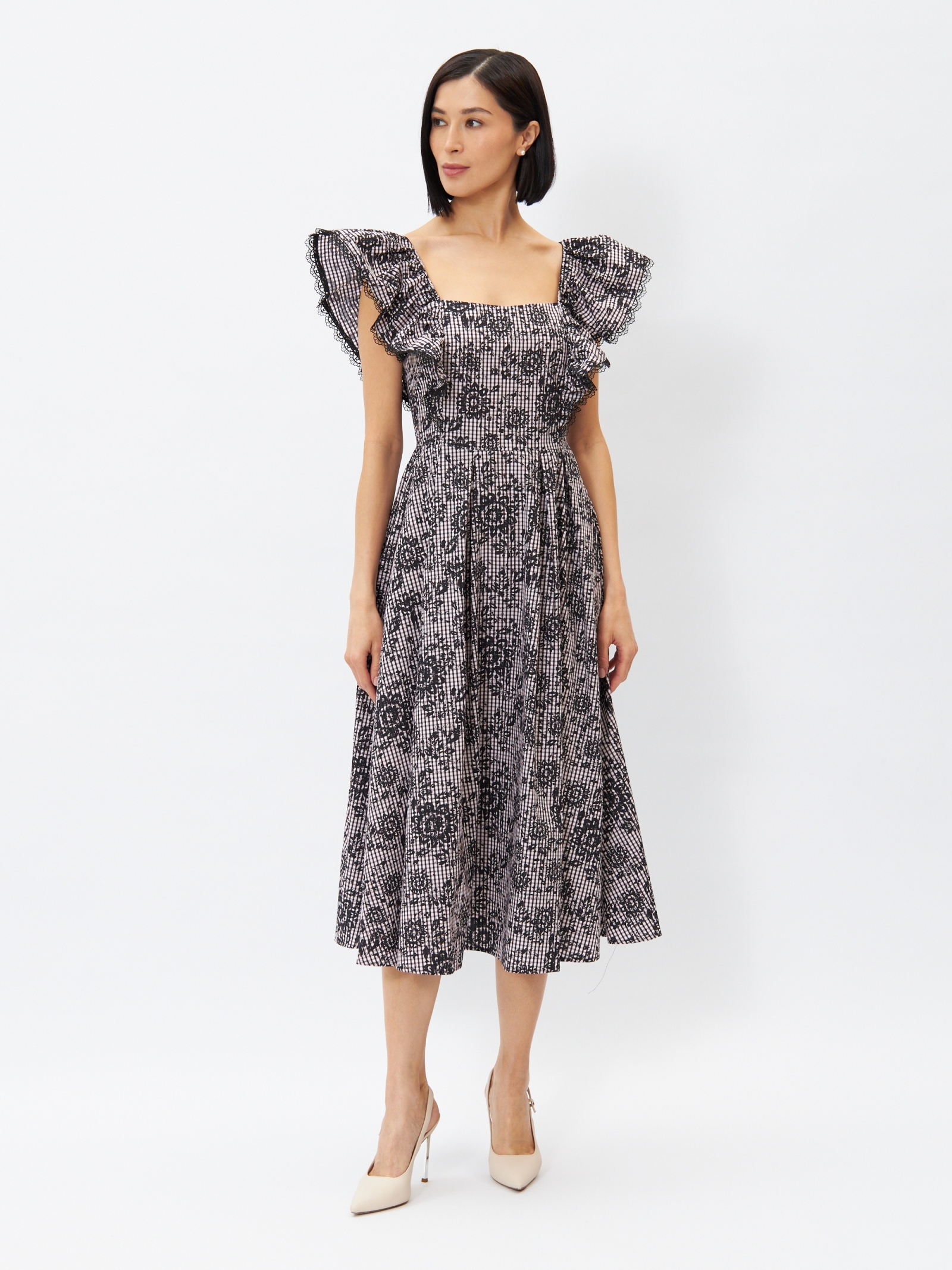 Платье из хлопка с отделкой из кружева OD-945-1 клетка ч/б с напылением