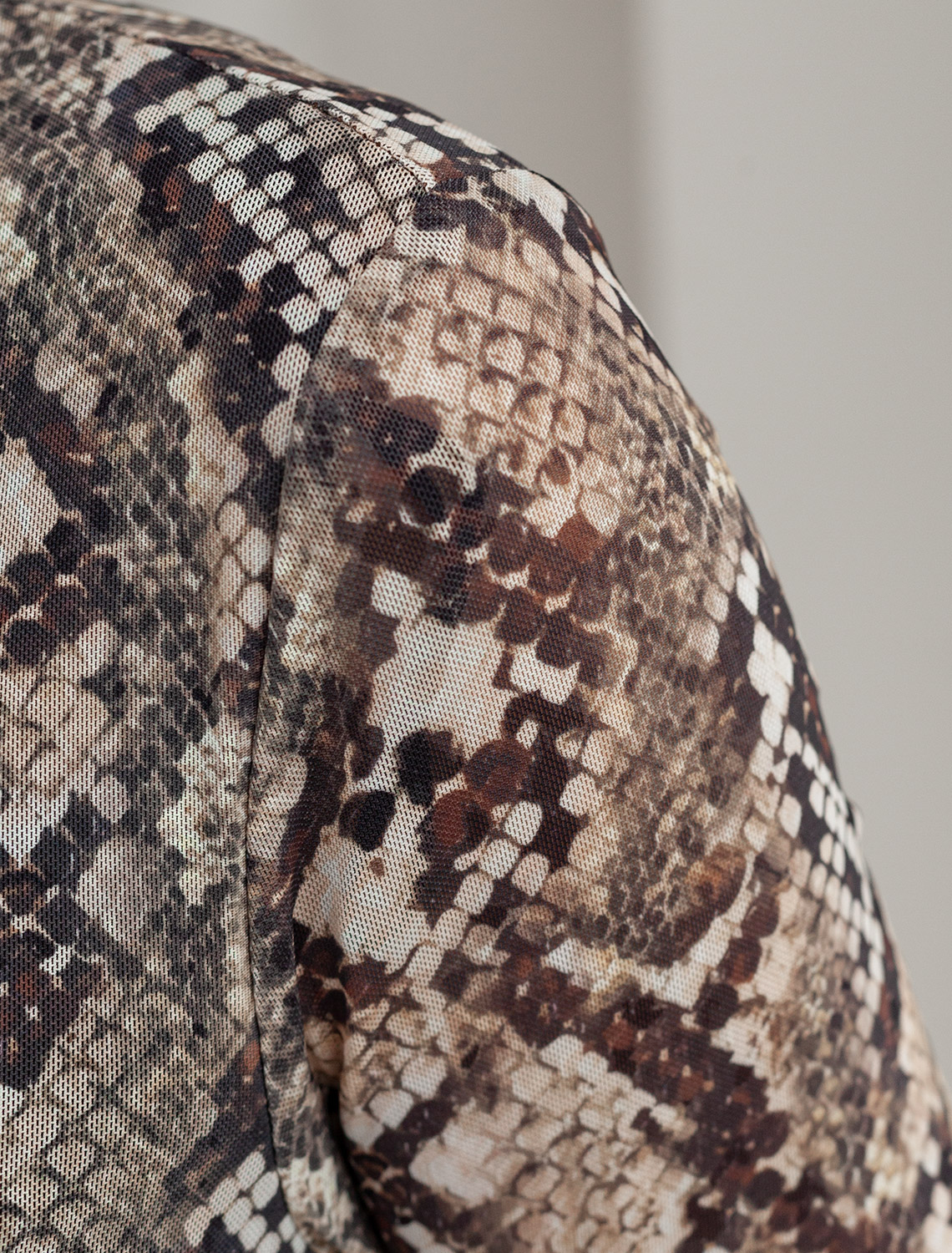 Трендовая модель с эффектным змеиным принтом в коричнево-бежевой гамме. Прямой крой из мягкой сетки на вискозной подкладке создает изящный силуэт. Игра полупрозрачной ткани и подклада добавляет глубину образу. Идеально для вечерних образов с золотистыми аксессуарами. 95%ПЭ 5%ПУ, ПОДКЛАДКА: 95%Вис 5%ПУ