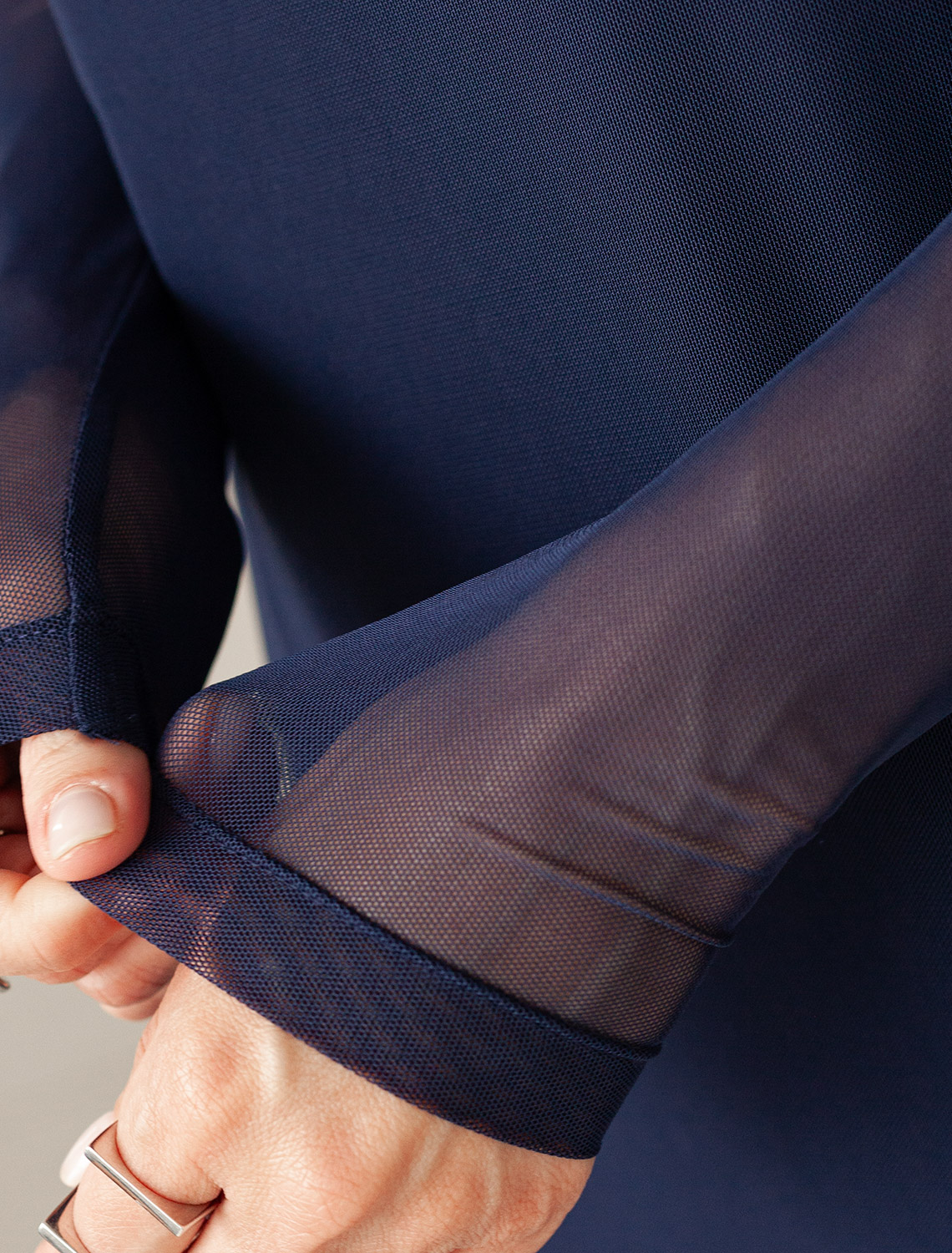 Модель выполнена из воздушной сетчатой ткани с вискозной подкладкой, которая подчеркивает фигуру. Прямой крой создает стройный силуэт. Богатый темно-синий цвет создает эффект глубины и роскоши. Прозрачные рукава добавляяют образу пикантности. Идеально подходит как для вечерних выходов, так и для повседневного образа. 95%ПЭ 5%ПУ, ПОДКЛАДКА: 95%Вис 5%ПУ