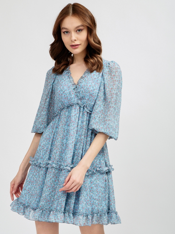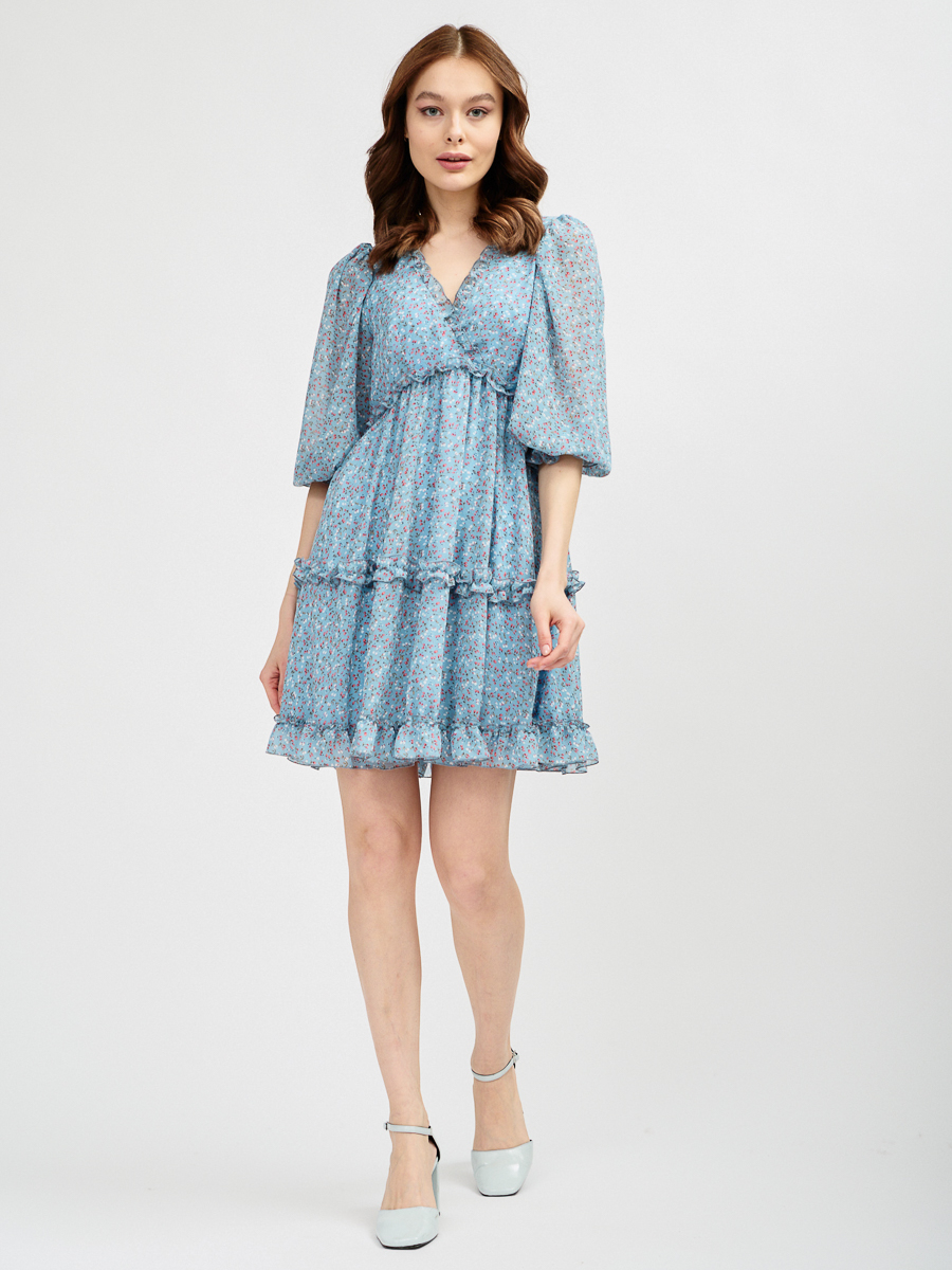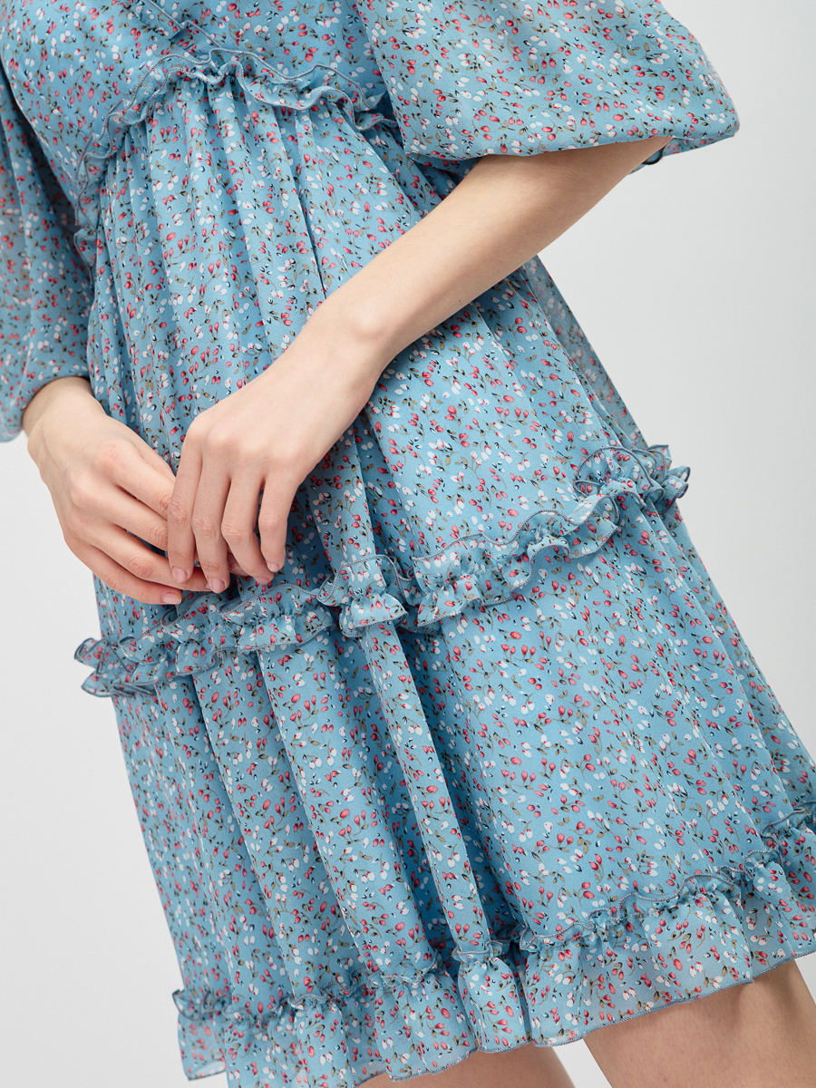Платье А- силуэта из шифона с цветочным принтом на подкладке. V – обазный вырез на запах. Втачной рукав ¾ со сборкой по плечу, сборкой на резинку по низу и рюшей. Завышенная линия талии. 2 Яруса волана со сборкой. Потайная молния в боковом шве. Платье украшено рюшами по вырезу горловины, талии и двойными на воланах. Рост модели 170 см. Изделие на модели 42р-ра. Длина изделия 85,7 см. Машинная стирка при 30 градусах