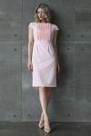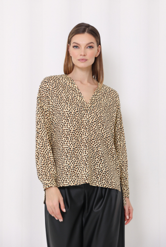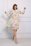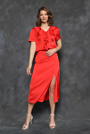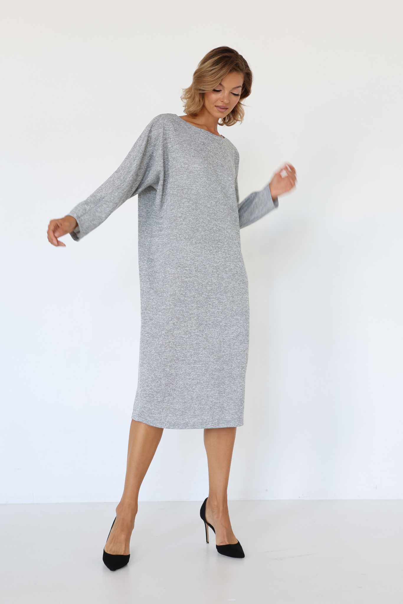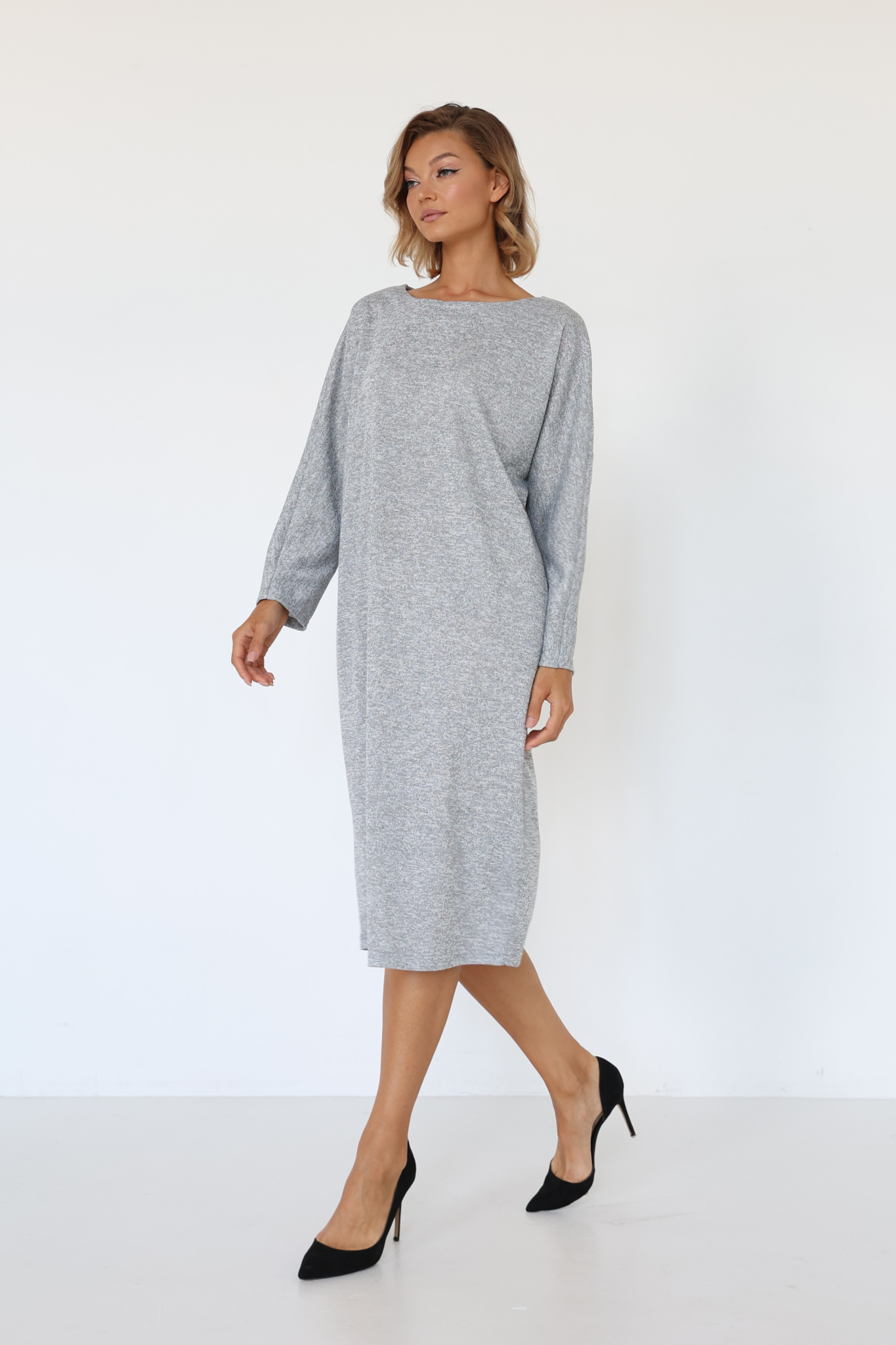 Платье миди свободного кроя со спущенным плечевым швом. V-образная форма горловины по спинке.