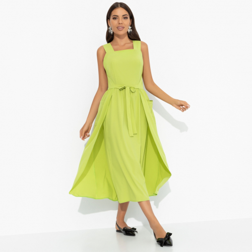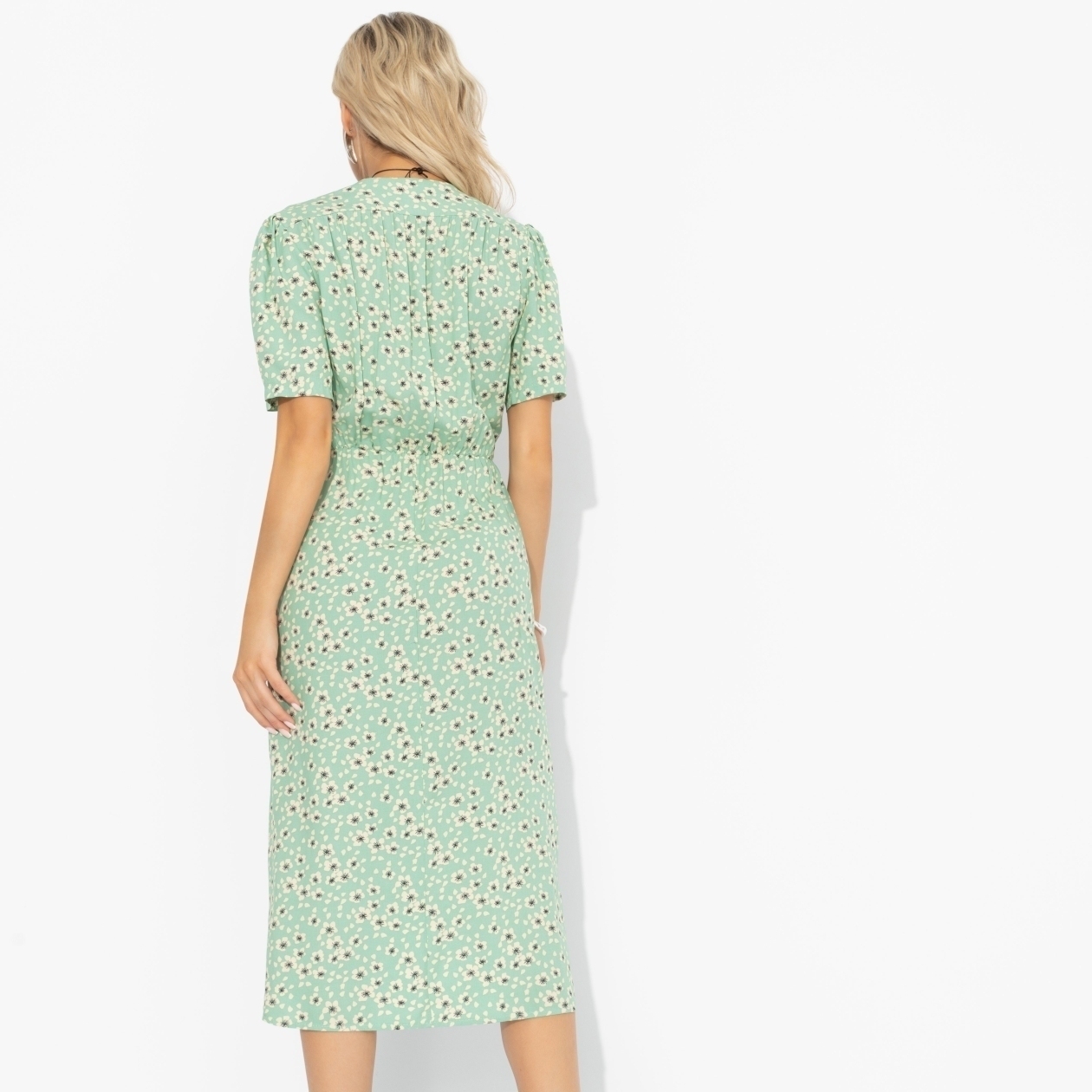Когда вы с компанией друзей собрались на пикник, лишь ты одна выбрала платье. Изумительный наряд в мягком зеленом цвете от CHARUTTI отлично сочетался с флорой и выгодно выделялся среди спортивных костюмов. Не удивительно, что первые горячие кусочки жаренного на костре маршмеллоу доставались именно тебе. Платье приталенного силуэта в длине миди. Разрез спереди. Сборка декоративная в зоне декольте. Акцент на талии за счет тонкой скрытой резинки.